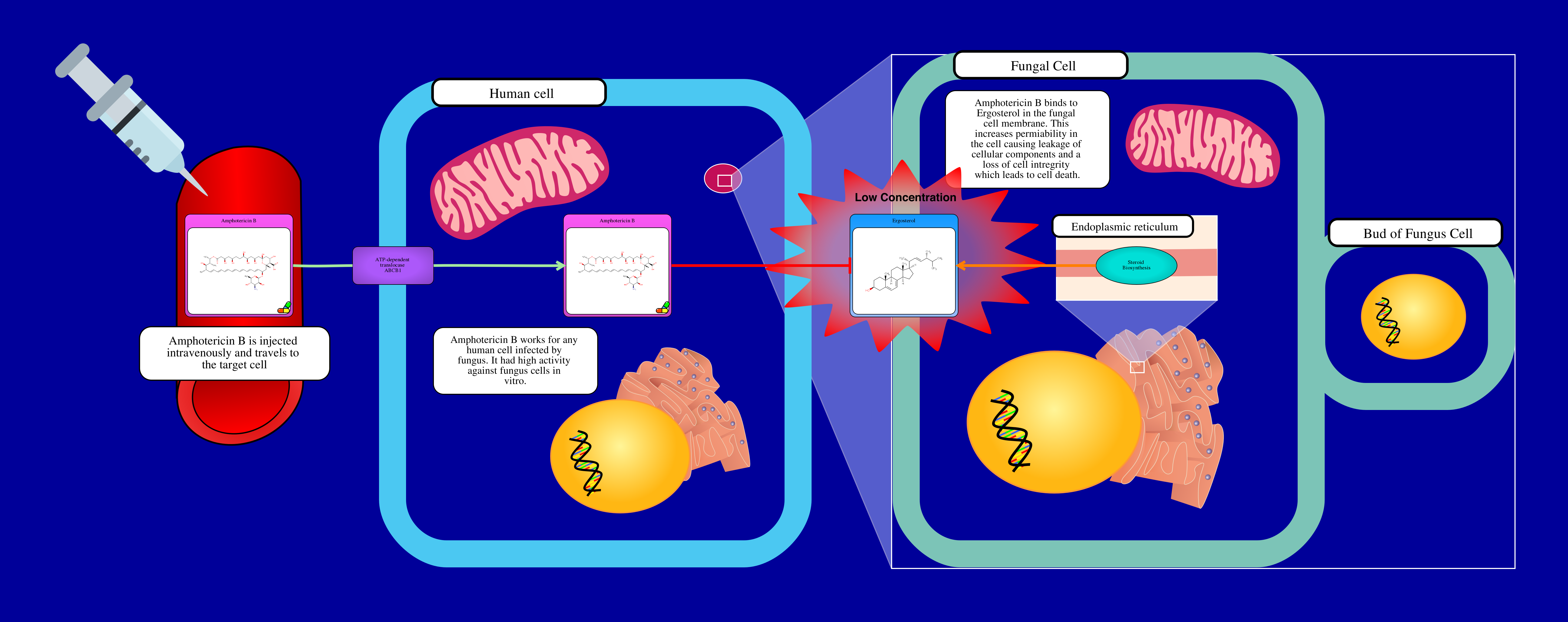 Amphotericin B is an anti-fungal drug that is injected intravenously and travels to the target cell through the blood where it is transported into the cell so it can target the fungal cells. It is most effective against candida albicans, but still somewhat effective against other fungal species. This drug has no effect on bacteria, rickettsiae, and viruses. It is used to treat fungal infections in Neutropenic patients, cryptococcal meningitis in HIV infection, fungal infections, and leishmaniasis. It has shown high activity in vitro, but mechanisms in the body are more unknown.
