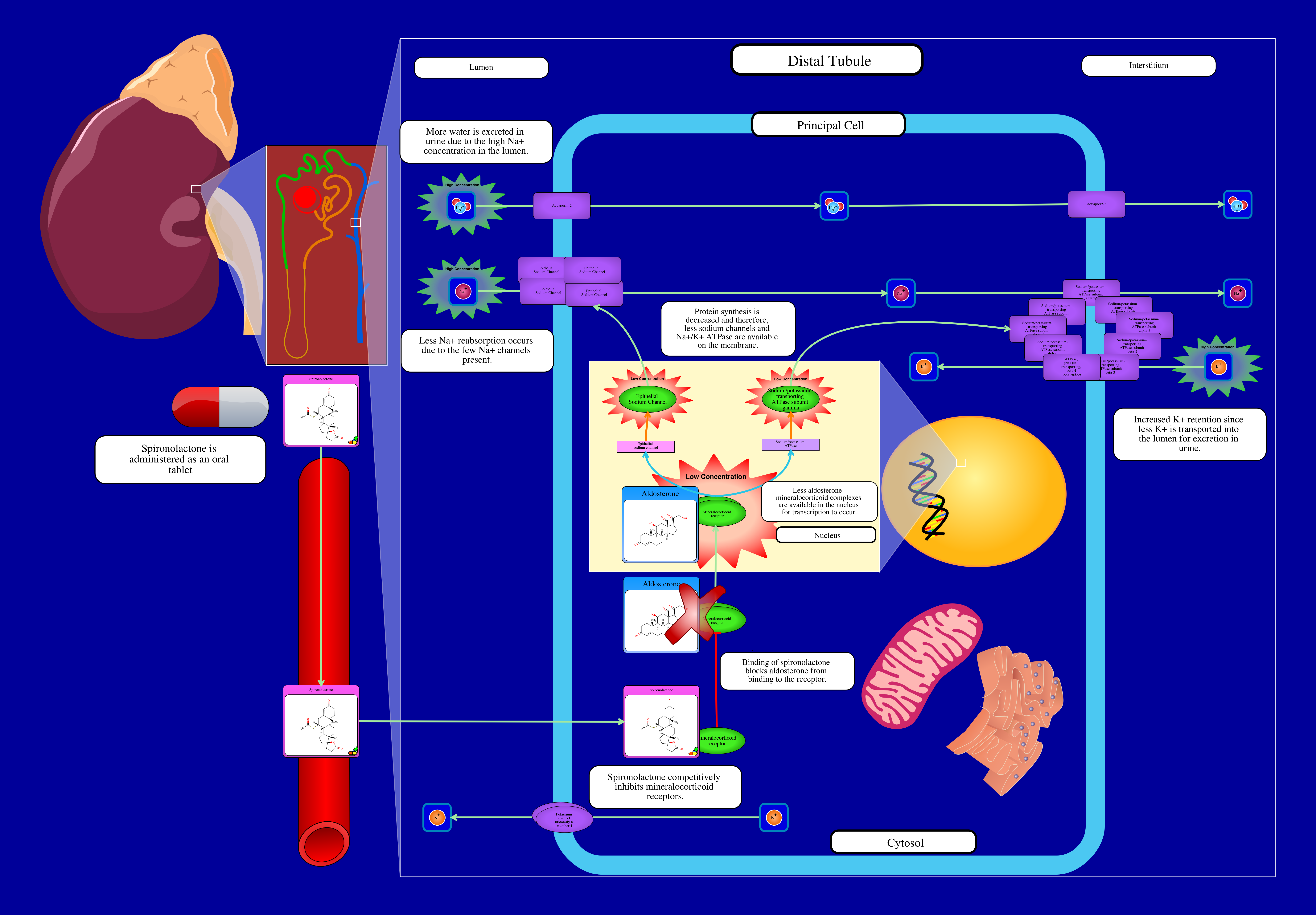 Spironolactone is a steroidal, non specific, orally administered aldosterone antagonist used mainly for its antihypertensive effects. This drug is used to treat heart failure, hyperaldosteronism, hypertension, adrenal hyperplasia, edema, and nephrotic syndrome. It has also been shown to decrease proteinuria. Spironolactone can be found under the brand names Aldactazide, Aldactone, and Carospir. The main target of spironolactone is the distal convoluted tubule in the nephron of the kidneys where it competitively inhibits mineralocorticoid receptors (MRs) in the principal cells to promote sodium (Na+) and water (H2O) excretion and potassium (K+) retention. Once spironolactone is bound to the MR, it blocks aldosterone from binding which inhibits aldosterone dependent sodium potassium exchange channels and results in the antihypertensive effects seen by causing alterations to the Na+:K+ ratio. Aldosterone is a mineralocorticoid hormone responsible for contributing to the regulation of blood pressure, sodium reabsorption, and potassium excretion and therefore, plays a role in blood pressure via the RAAS pathway. In the principal cells of the distal convoluted tubule, sodium and water reabsorption occur, along with potassium excretion. The sodium channel (ENaC) transports Na+ from the tubule lumen into the principal cells, then the NA+/K+ ATPase pumps the Na+ into the interstitium where it reabsorbed into the blood. K+ ions are pumped into the principal cell from the interstitium via the Na+/K+ ATPase, then the K+ channel transports K+ from the cell into the lumen where it is excreted in urine. Water reabsorption is linked to Na+ reabsorption and occurs via the aquaporins. Activation of the RAAS system leads to increased production of aldosterone, which is produced by the adrenal cortex in the zone glomerulosa. Following binding of aldosterone, the mineralocorticoid receptors undergo dimerization and activation and move into the nucleus where they undergo transcription. Protein is then synthesized in the cytosol. This effect on gene transcription leads to an upregulation of sodium channels in the apical membrane and Na+/K+ ATPase in the basolateral membrane, aiding an increase in Na+ and water reabsorption and K+ excretion. This change in ion concentrations leads to an increased effective circulating volume. By blocking the binding of aldosterone, the RAAS system. This prevents the aldosterone effects on gene transcription, therefore, there is a decrease in Na+ channels and Na+/K+ ATPase in the membrane. Sodium reabsorption decreases, the concentration of Na+ in the lumen becomes high and as a result, water reabsorption also decreases. The effects on Na+/K+ ATPase results in reduced K+ excretion. This effect of spironolactone is important for treating conditions like hypertension because the increased water excretion in urine leads to decreased blood plasma volume, lowering blood pressure. One of the limitations of aldosterone blockage with spironolactone is the increased risk of hyperkalaemia and increased serum creatinine levels. The maximal hypotensive effects seen from spironolactone often require 3-4 weeks to be fully expressed and may persist 1-2 weeks after discontinuation, this is because spironolactone is a prodrug with multiple active metabolites with long half lives such as canrenone which is metabolized in the liver by hepatocytes. Spironolactone has also been shown to have antiandrogenic activity as well contributing to off label uses. Spironolactone has moderate affinity for progesterone and androgen receptors which increases the likelihood of side effects such as loss of libido, menstrual irregularities, gynecomastia, and impotence, Structurally, spironolactone contains elements of progesterone leading to those progestognenic and antiandrogenic adverse effects. Some side effects of using spironolactone may include feeling dizzy, experiencing muscle cramps, feeling tired and low in energy, and experiencing breast pain and enlargement.
