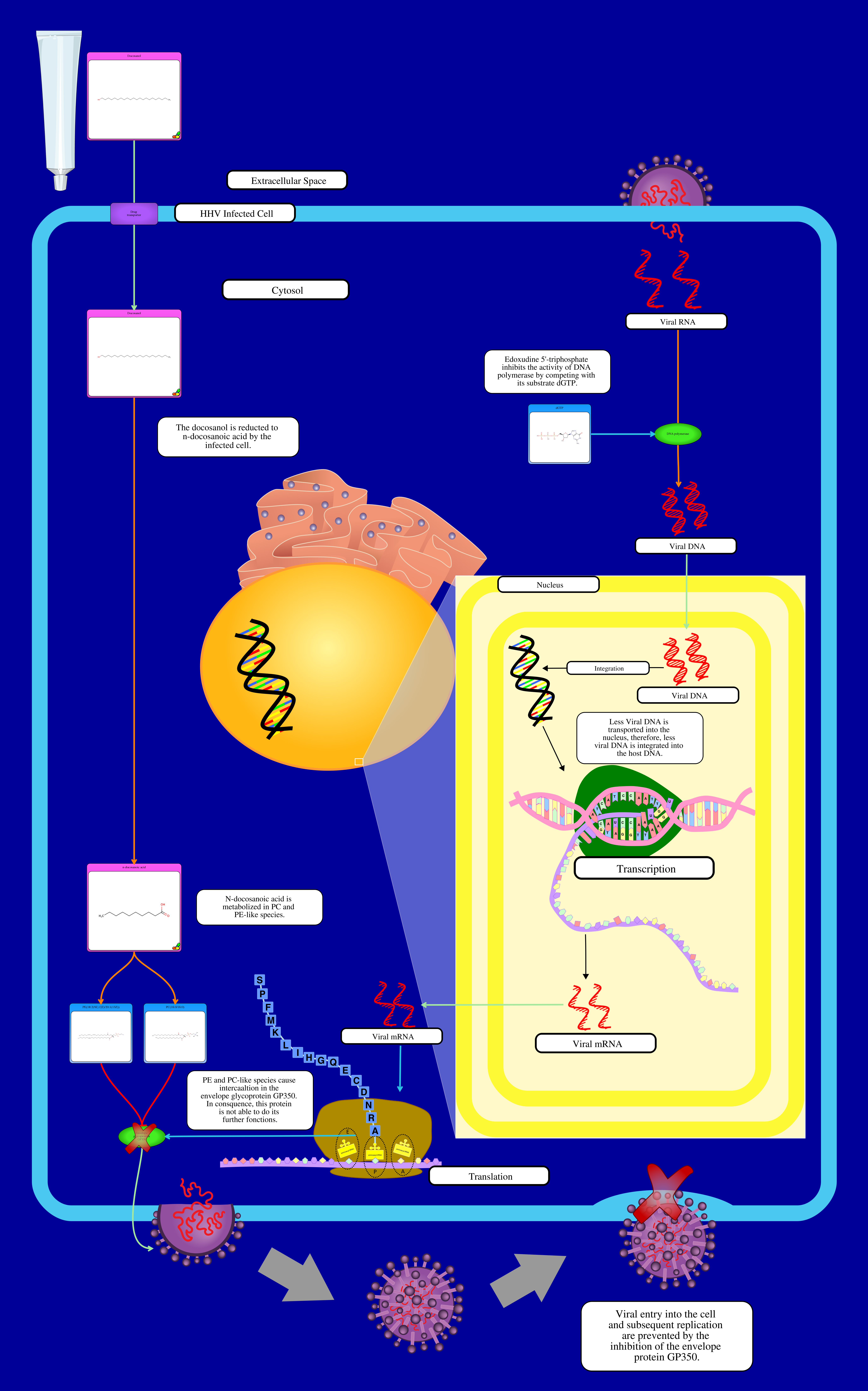 Herpes simplex virus 1 (HSV-1) is a neurotropic virus with DNA, it causes orofacial diseases in humans. Herpes simplex virus 2 (HSV-2) primarily affects the anogenital region. Docosanol is an antiviral used as a topical cream to treat recurrent herpes simplex labialis episodes (episodes of cold sores or fever blisters). This saturated aliphatic alcohol molecule exhibits antiviral activity against some lipid-enveloped viruses. It speeds the healing of cold sores or/and fever blisters on the face and lips. The mechanism of action is to inhibit the fusion between the host cell plasma membrane and the HSV envelope. This drug prevents viral entry and subsequent viral replication. In this way, docosanol does not act directly on the virus; as such, it is unlikely it will produce drug-resistant mutants of the virus Docosanol enters the cell and is oxidized as n-docosanoic acid. This last molecule can incorporate itself in ether lipids. When the n-docosanoic acid gets incorporated in the formation of the envelope glycoprotein GP350, the upcoming viruses will not attach to the host B-lymphocyte cell, then it will not enter the cell.