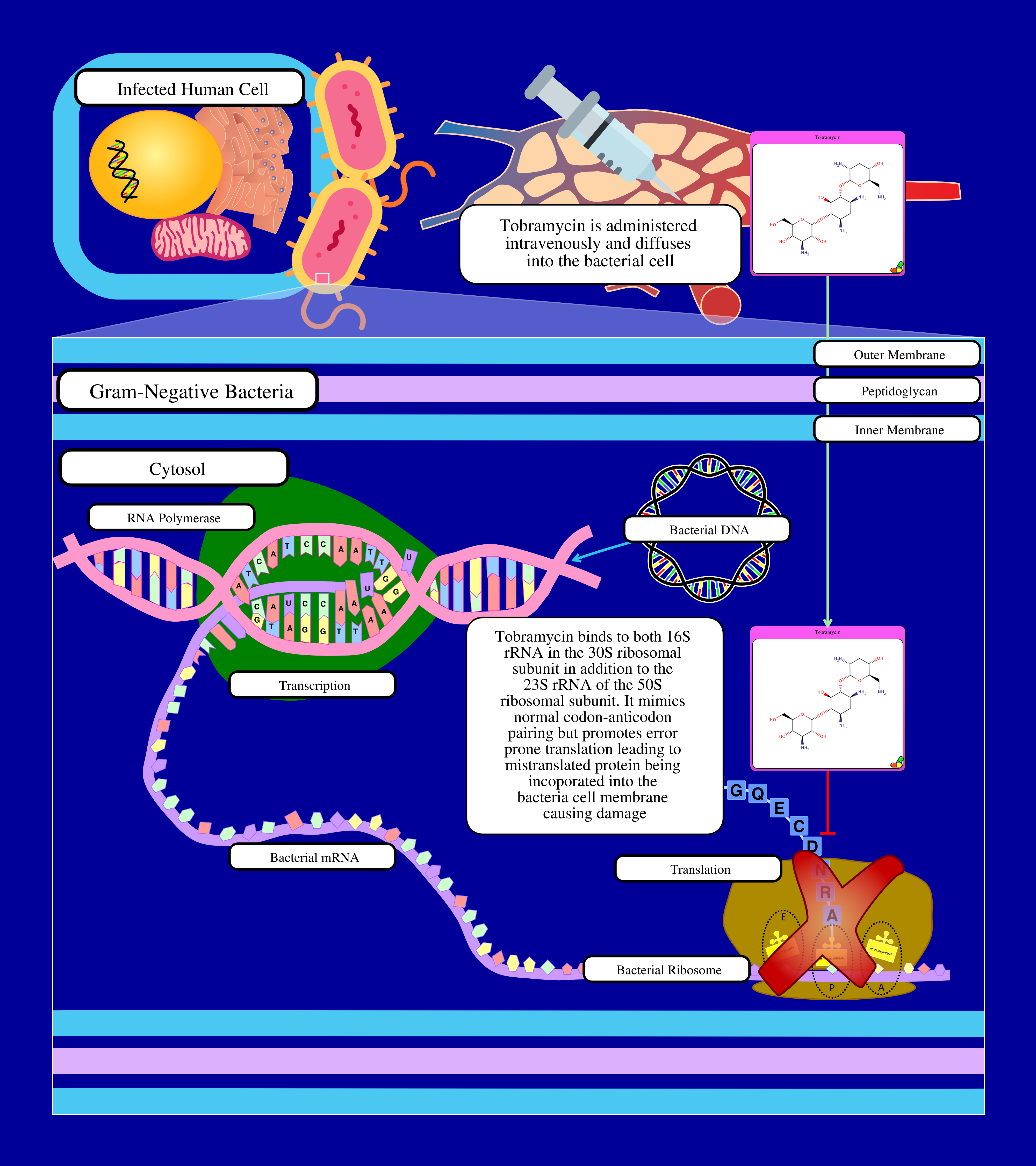 Tobramycin is an antibiotic that is commonly used to treat bacterial infections such as cystic fibrosis-associated bacterial, lower respiratory tract, urinary tract, eye, skin, and bone infections. This drug is a part of the aminoglycoside antibiotics family. It can be administered via inhalation, injection (intravenously or intramuscular), or even via topical cream. Tobramycin acts by binding to bacterial membranes causing displacement of divalent cations and increasing membrane permeability allowing entry into the bacterial cell. Once inside the bacterial cell, tobramycin then targets the bacterial 30S ribosome and binds to it, halting protein synthesis. It binds to the site where the normal base pairing of codon and anti-codon takes place as well as adding amino acids to the growing polypeptide chain, with this blocked it leads to termination of the chain and production of non-functional proteins. The adverse effects of tobramycin are not well known therefore if a patient is experiencing overdose hemodialysis should be performed to clear the excess of tobramycin as they are at risk of nephrotoxicity, ototoxicity, neuromuscular blockade, respiratory paralysis, and/or respiratory failure.