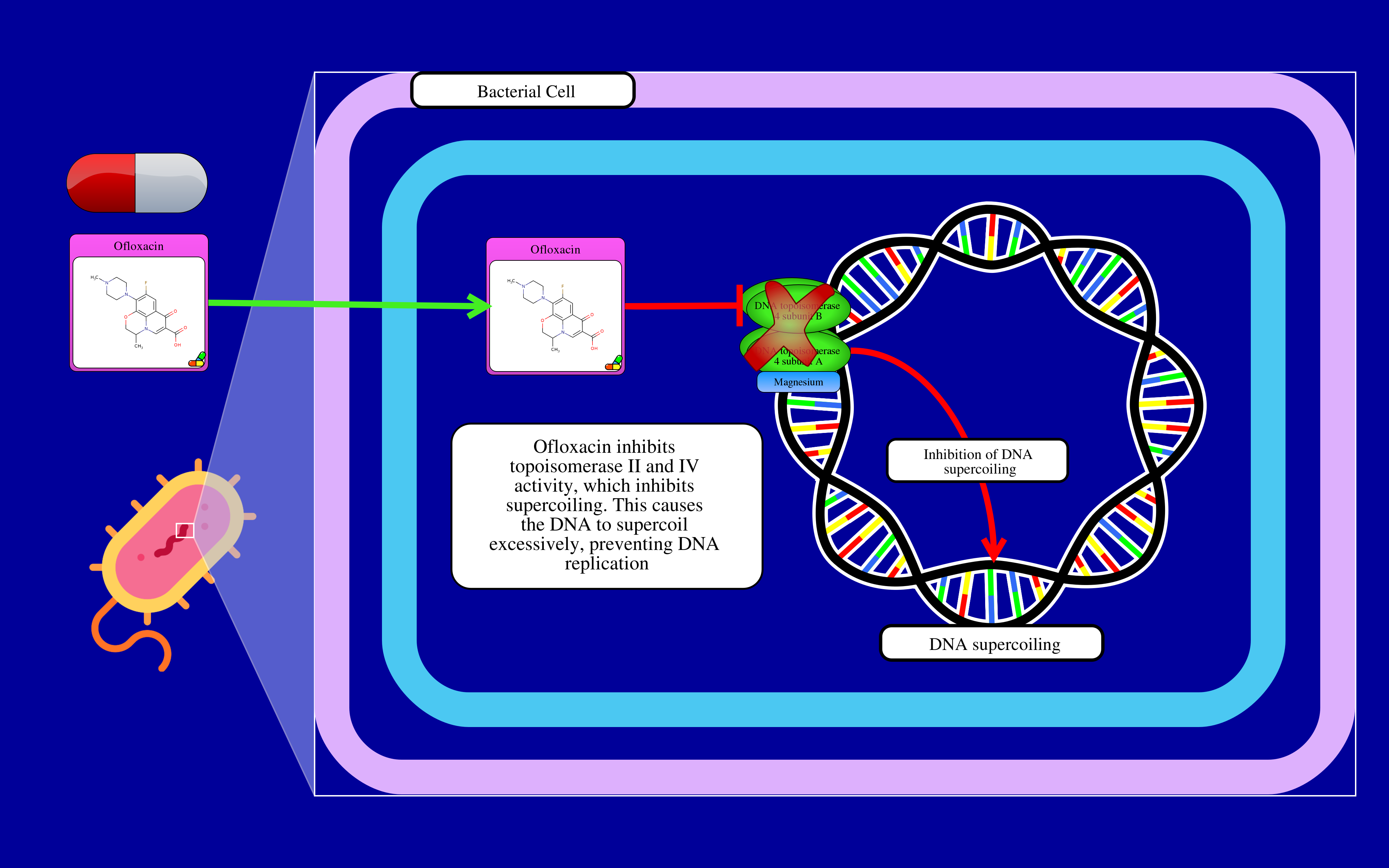 Ofloxacin inhibits DNA gyrase (topoisomerase II) and topoisomerase IV. These proteins prevent supercoiling in bacterial DNA. The inhibition of DNA gyrase (topoisomerase II) and topoisomerase IV causes supercoiling of the bacterial DNA. This prevents DNA replication.