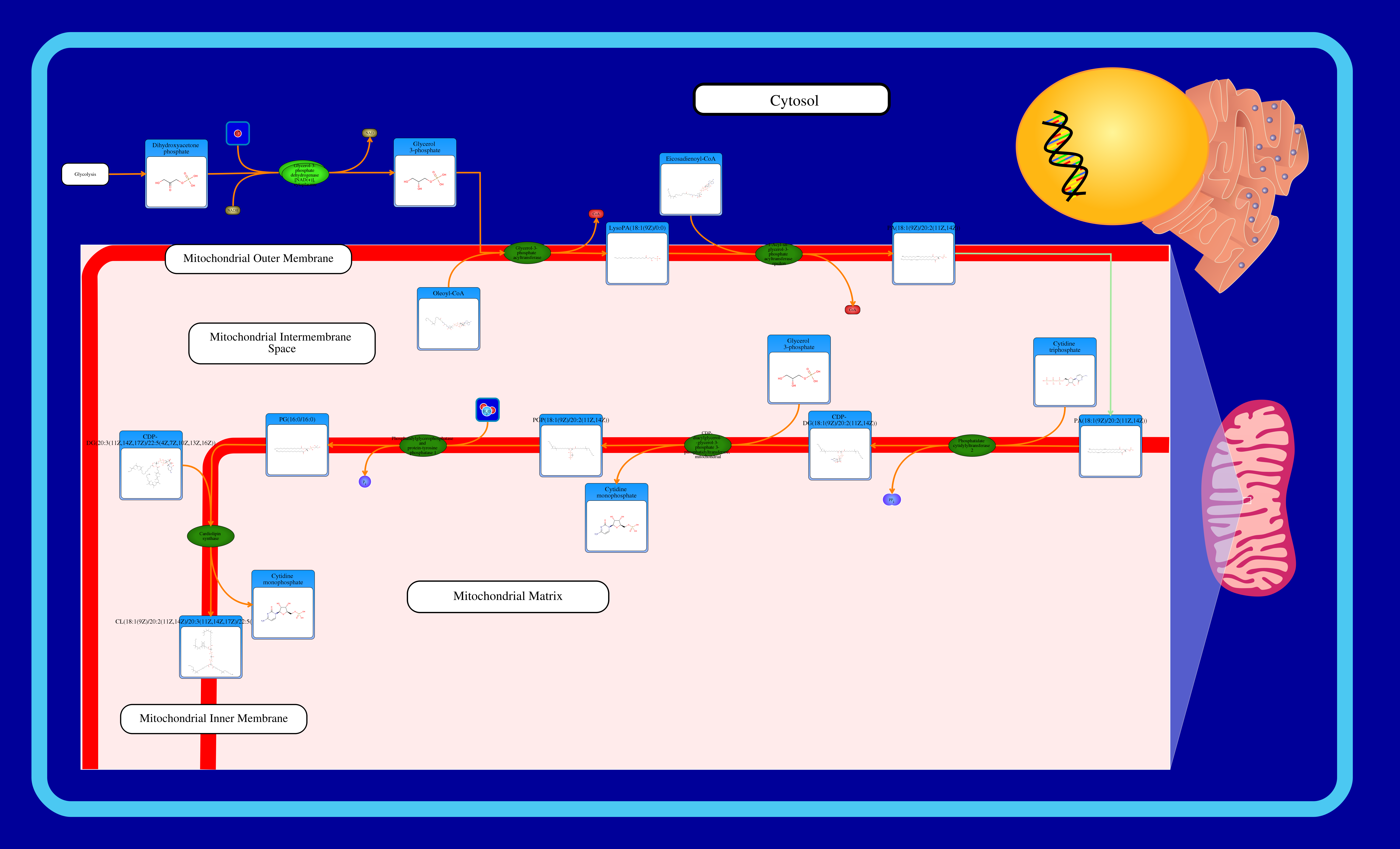 Cardiolipin (CL) is an important component of the inner mitochondrial membrane where it constitutes about 20% of the total lipid composition. It is essential for the optimal function of numerous enzymes that are involved in mitochondrial energy metabolism (Wikipedia). Cardiolipin biosynthesis occurs mainly in the mitochondria, but there also exists an alternative synthesis route for CDP-diacylglycerol that takes place in the endoplasmic reticulum. This second route may supplement this pathway. All membrane-localized enzymes are coloured dark green in the image. First, dihydroxyacetone phosphate (or glycerone phosphate) from glycolysis is used by the cytosolic enzyme glycerol-3-phosphate dehydrogenase [NAD(+)] to synthesize sn-glycerol 3-phosphate. Second, the mitochondrial outer membrane enzyme glycerol-3-phosphate acyltransferase esterifies an acyl-group to the sn-1 position of sn-glycerol 3-phosphate to form 1-acyl-sn-glycerol 3-phosphate (lysophosphatidic acid or LPA). Third, the enzyme 1-acyl-sn-glycerol-3-phosphate acyltransferase converts LPA into phosphatidic acid (PA or 1,2-diacyl-sn-glycerol 3-phosphate) by esterifying an acyl-group to the sn-2 position of the glycerol backbone. PA is then transferred to the inner mitochondrial membrane to continue cardiolipin synthesis. Fourth, magnesium-dependent phosphatidate cytidylyltransferase catalyzes the conversion of PA into CDP-diacylglycerol. Fifth, CDP-diacylglycerol--glycerol-3-phosphate 3-phosphatidyltransferase synthesizes phosphatidylglycerophosphate (PGP). Sixth, phosphatidylglycerophosphatase and protein-tyrosine phosphatase dephosphorylates PGP to form phosphatidylglycerol (PG). Last, cardiolipin synthase catalyzes the synthesis of cardiolipin by transferring a phosphatidyl group from a second CDP-diacylglycerol to PG. It requires a divalent metal cation cofactor.