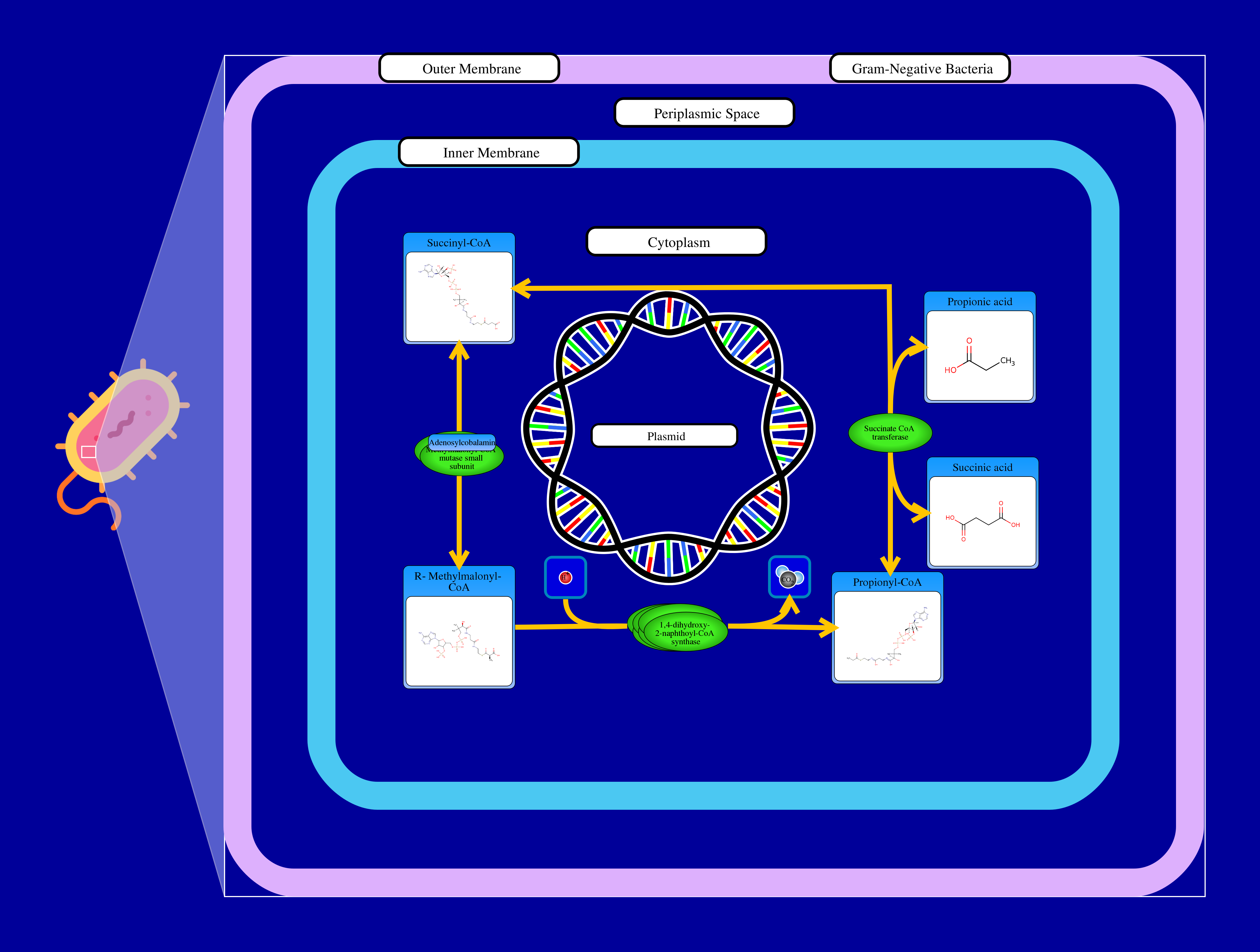 The enzymes involved in the decarboxylation of succinate to propionate are encoded in the Escherichia coli operon. A CoA transferase reaction is catalyzed by YgfH with succinyl CoA and propionyl CoA donating and succinate and propionate accepting. Sbm, sleeping beauty mutase or methylmalonyl-CoA mutase, is an apoenzyme that is activated by binding of adenosylcobalamin. Sbm catalyzes the methylmalonyl CoA mutase reaction. The metabolic function if this pathway is still unknown.
