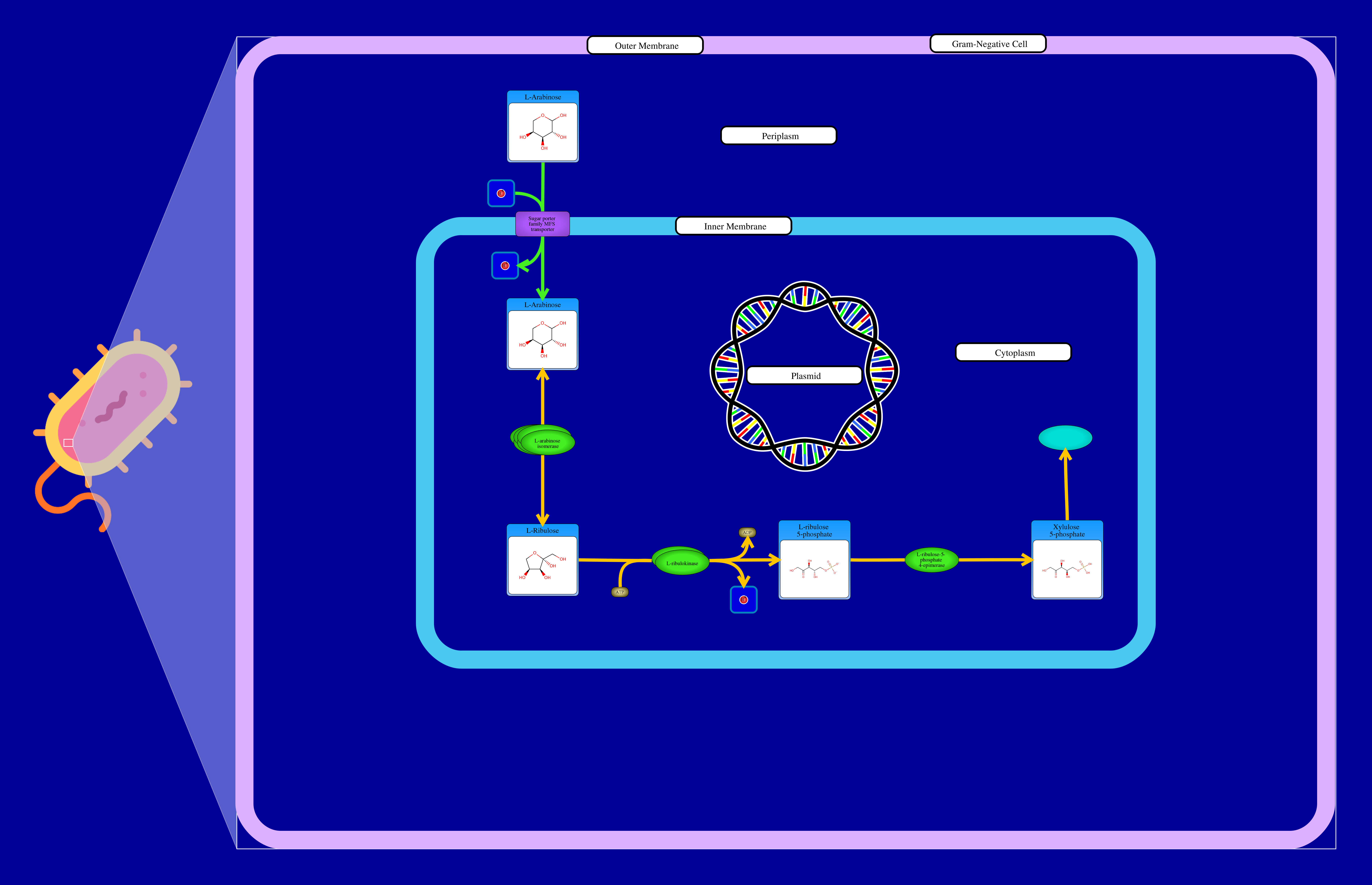 L-arabinose enters E. coli unphosphorylated via a low-affinity proton-driven transporter (AraE) or a high-affinity ATP-driven system (AraFGH). Following entry, it is converted to L-ribulose-5-phosphate by an isomerase and kinase. L-ribulose-5-phosphate is then converted by an epimerase to the pentose phosphate pathway intermediate, D-xylulose-5-phosphate. D-xylulose-5-phosphate then enters metabolism pathways to become precursor metabolites, reducing power and metabolic energy.