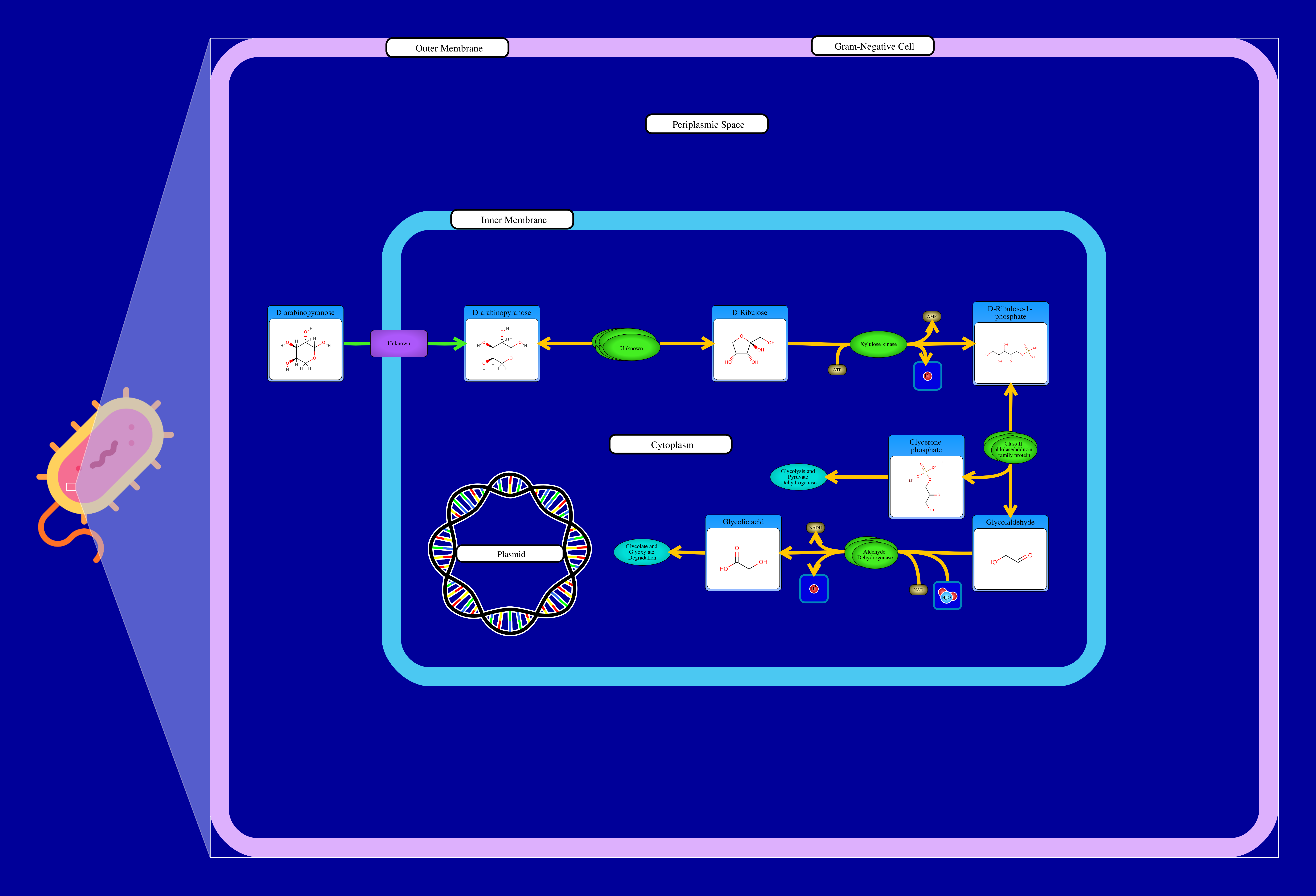 Wild-Type E.coli K-12 can not directly use D-arabinose as a sole source of carbon and energy; hence, E.coli uses the enzymes of the fucose degradation pathway to degrade D-arabinose for further utilization. D-arabinose can be metabolized to form dihydroxy-acetone phosphate for entering the central metabolism. Glycolaldehyde can be further catalyzed to form glycolic acid by lactaldehyde dehydrogenase.