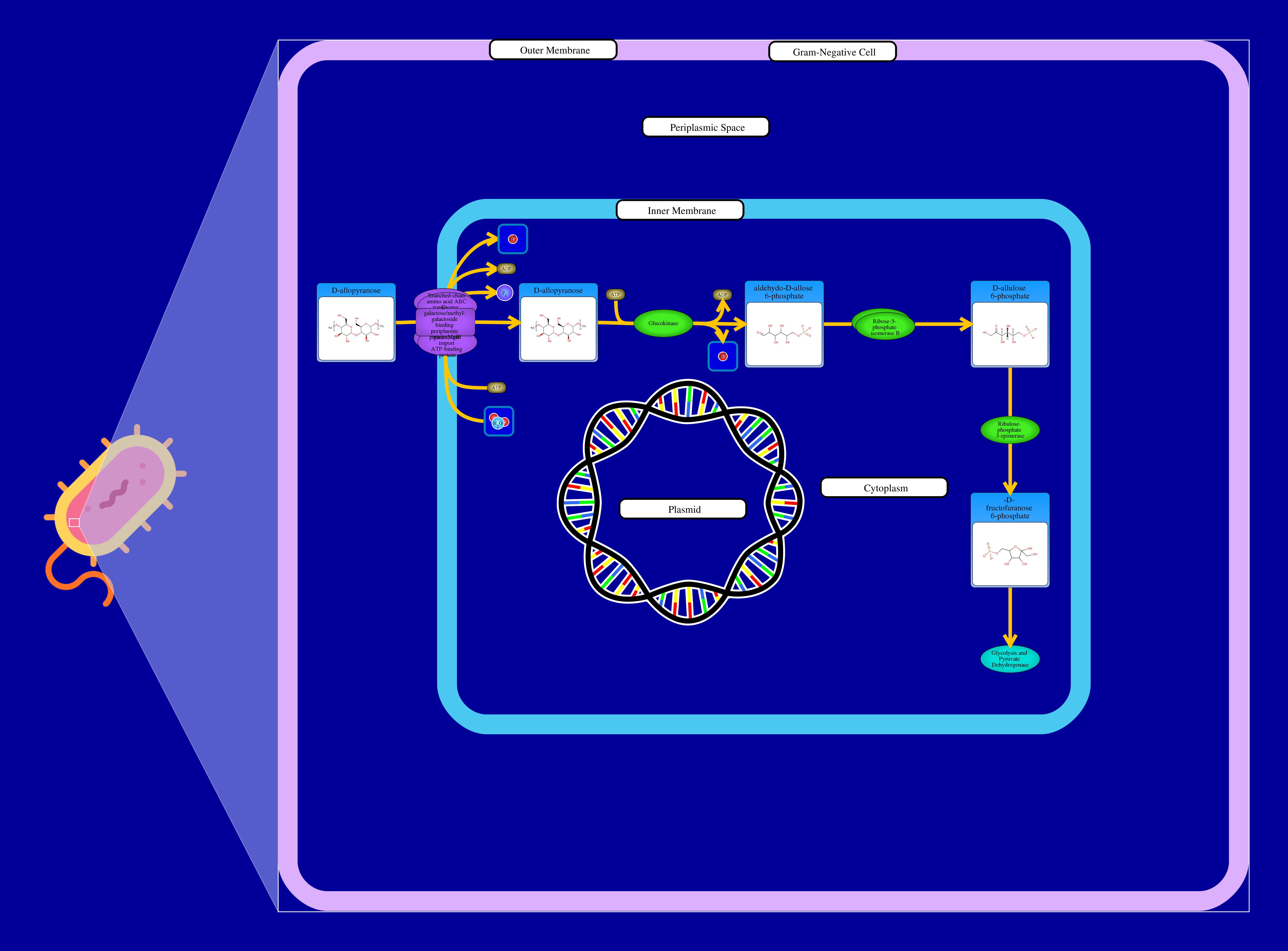 D-allose can be used as source of carbon for E.coli. D-allose is imported into E.coli by D-allose ABC transporter without phosphorylation. Allose-6-phosphate isomerase and allulose-6-phosphate 3-epimerase catalyze the remaining reactions resulting in D-allulose 6 phosphate and Beta-D-fructofuranose 6-phosphate respectively. Once Beta D fructofuranose 6-phosphate is synthesized, it can be used in the glycolysis and pyruvatedehydrogenase pathway.