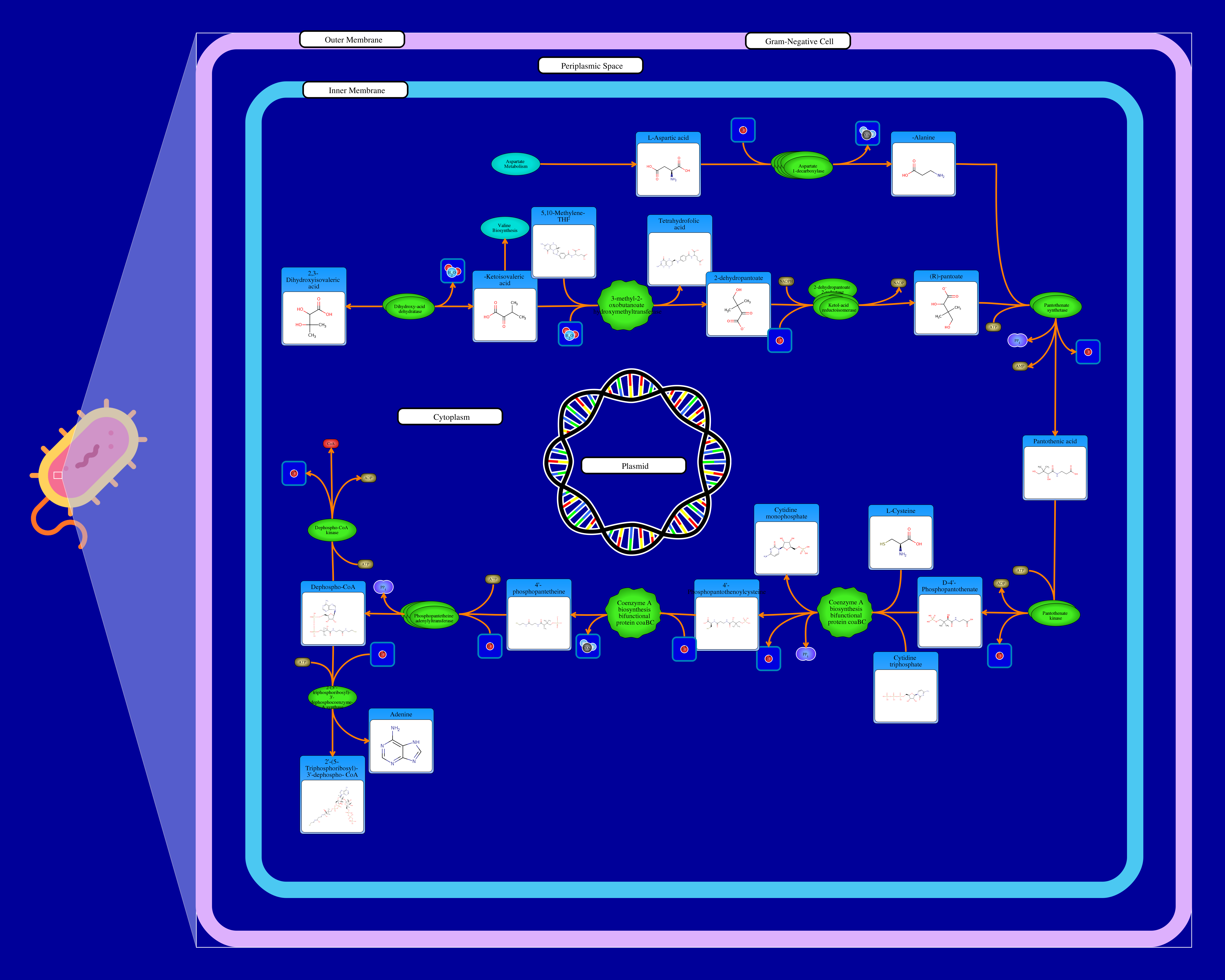 The CoA biosynthesis requires compounds from two other pathways: aspartate metabolism and valine biosynthesis. It requires a Beta-Alanine and R-pantoate. The compound (R)-pantoate is generated in two reactions, as shown by the interaction of alpha-ketoisovaleric acid, 5,10 methylene-THF and water through a 3-methyl-2-oxobutanoate hydroxymethyltransferase resulting in a tetrahydrofolic acid and a 2-dehydropantoate. 2-dehydropantoate interacts with hydrogen through a NADPH driven acetohydroxy acid isomeroreductase resulting in the release of NADP and R-pantoate. On the other hand L-aspartic acid interacts with a hydrogen ion and gets decarboxylated through an Aspartate 1- decarboxylase resulting in a carbon dioxide and a Beta-alanine. Beta-alanine and R-pantoate interact with an ATP driven pantothenate synthetase resulting in pyrophosphate, AMP, hydrogen ion and pantothenic acid. Pantothenic acid is phosphorylated through a ATP-driven pantothenate kinase resulting in a ADP, a hydrogen ion and D-4'-Phosphopantothenate. The latter interacts with a CTP and a L-cysteine resulting in a fused 4'phosphopantothenoylcysteine decarboxylase and phosphopantothenoylcysteine synthetase resulting in a hydrogen ion, a pyrophosphate, a CMP and 4-phosphopantothenoylcysteine. The latter compound interacts with a hydrogen ion through a fused 4'-phosphopantothenoylcysteine decarboxylase and phosphopantothenoylcysteine synthetase resulting in the release of carbon dioxide and 4-phosphopantetheine. 4-phosphopantetheine reacts with ATP, hydrogen ion and an phosphopantetheine adenylyltransferase resulting in a release of pyrophosphate, and dephospho-CoA. Dephospho-CoA reacts with an ATP driven dephospho-CoA kinase resulting in a ADP , a hydrogen ion and a Coenzyme A. Dephospho-CoA also reacts with 2-(5''-triphosphoribosyl)-3'-dephosphocoenzyme-A synthase (citG) to form both adenine and 2'-(5-Triphosphoribosyl)-3'-dephospho-CoA. In this pathway, all enzymes are essential for the cell growth. Biosynthetic pathway for producing CoA is same for most organisms (with exception of differences in the functionality of involved enzymes). In plants, every step is catalyzed by monofunctional enzymes instead of biofunctional enzymes.