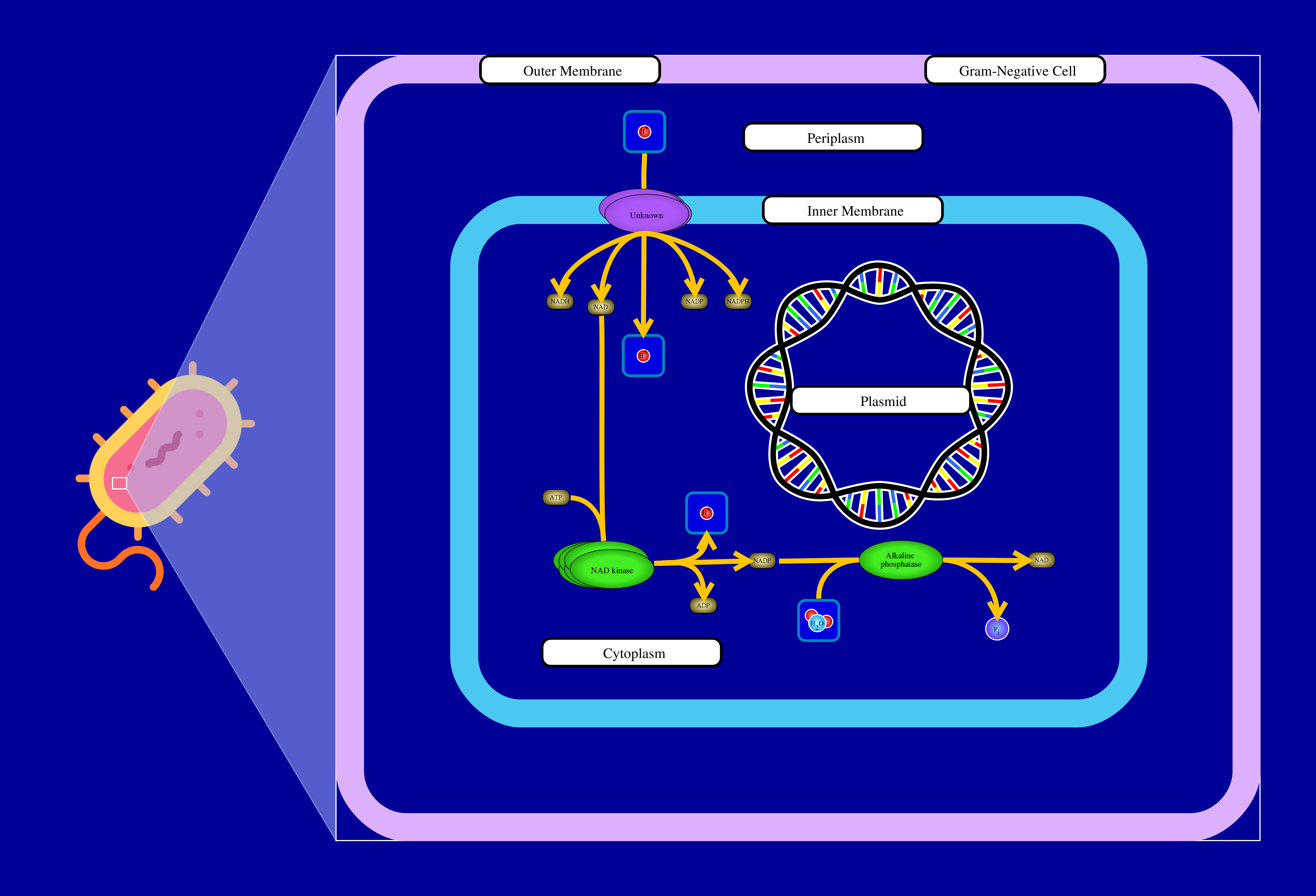 NAD kinase is required for converting NAD to NADP in various organisms such as groups of archaea, eubacteria and eukaryotes. For example, NAD kinase has shown its important role for the growth in Salmonella enterica and the importance in E.coli. NADP can be converted back to NAD via facilitation of alkaline phosphatase with water (hydroxylation).