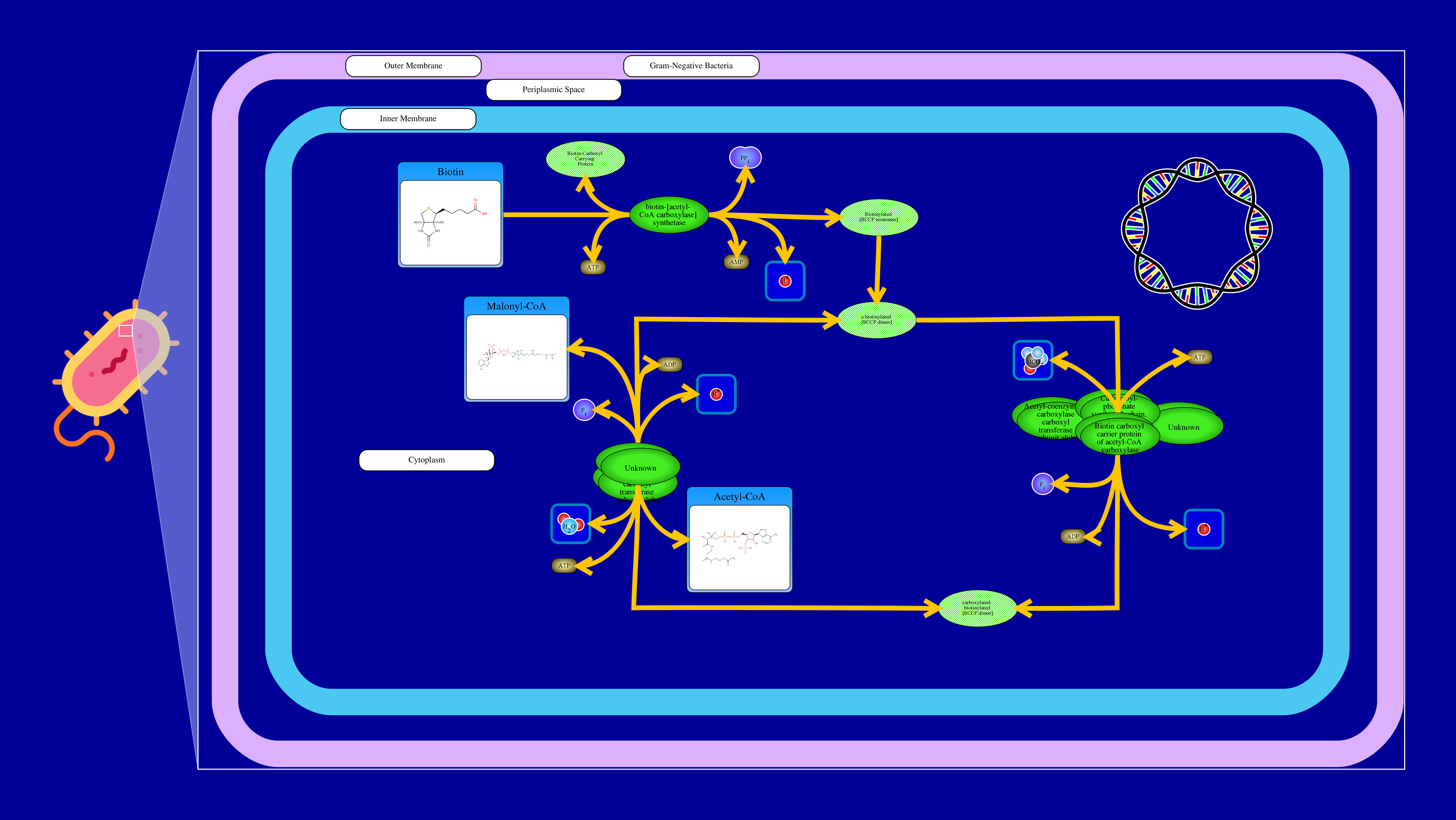 The assembly of a biotin-carboxyl carrier protein starts with a biotin carboxyl carrier protein monomer interacting with an ATP, and a biotin through a biotin -acetyl-coa-carboxylase ligase resulting in the release of a hydrogen ion, an AMP, a diphosphate and a biotynylated BCCP monomer. The latter compound reacts spontaneously to create a biotinylated BCCP dimer. This compound in turn reacts with a hydrogen carbonate and an ATP driven biotin carboxylase resulting in the release of ADP, a hydrogen Ion , a phosphate and a carboxylated biotinylated BCCP dimer.