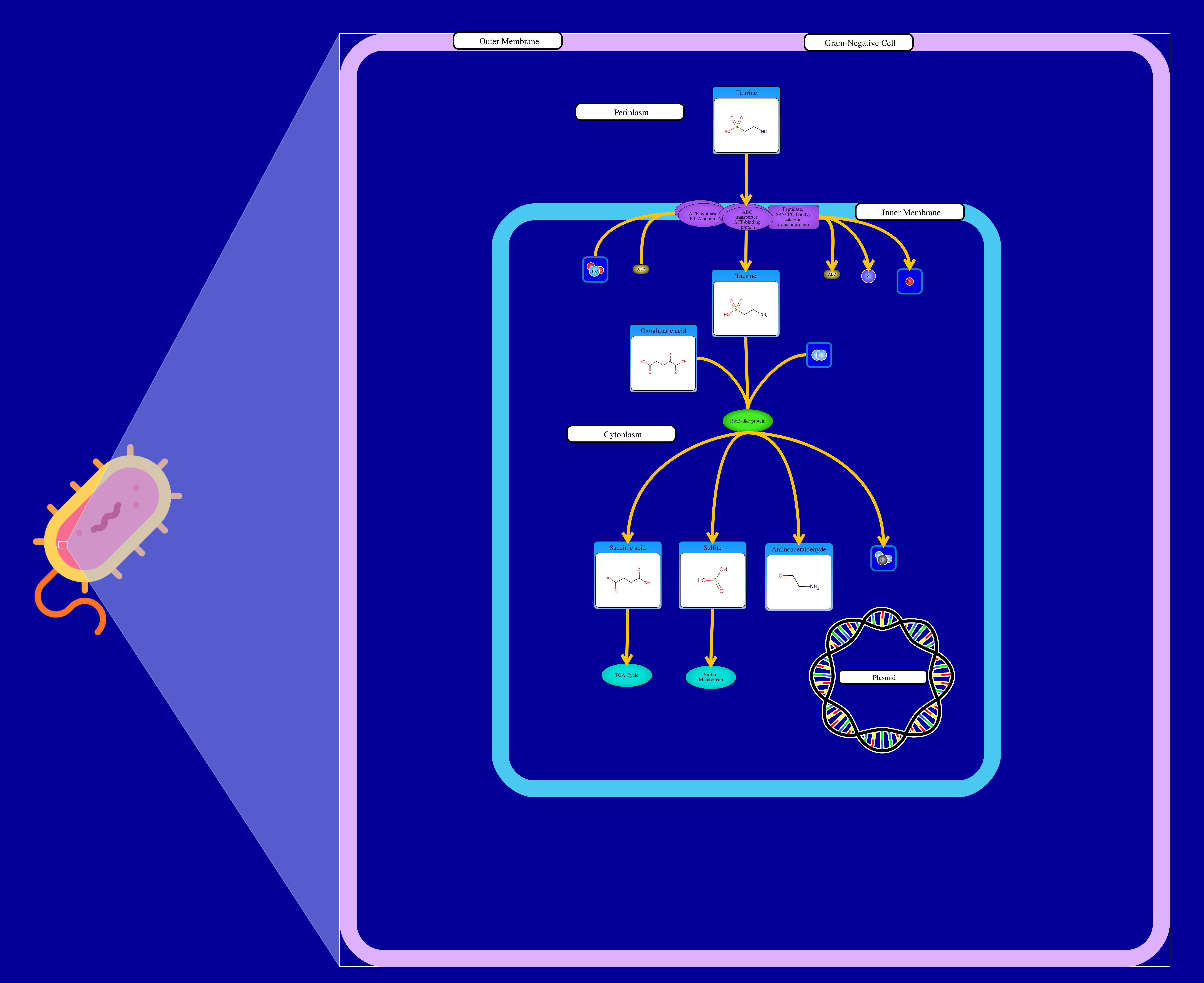 Taurine enters into the cytoplasm through a taurine ATP-binding cassette (ABC) transporters. Once inside, the enzyme taurine dioxygenase encourages the interaction between taurine, oxoglutaric acid and oxygen resulting in the release of succinic acid, sulfite, aminoacetaldehyde, and carbon dioxide.