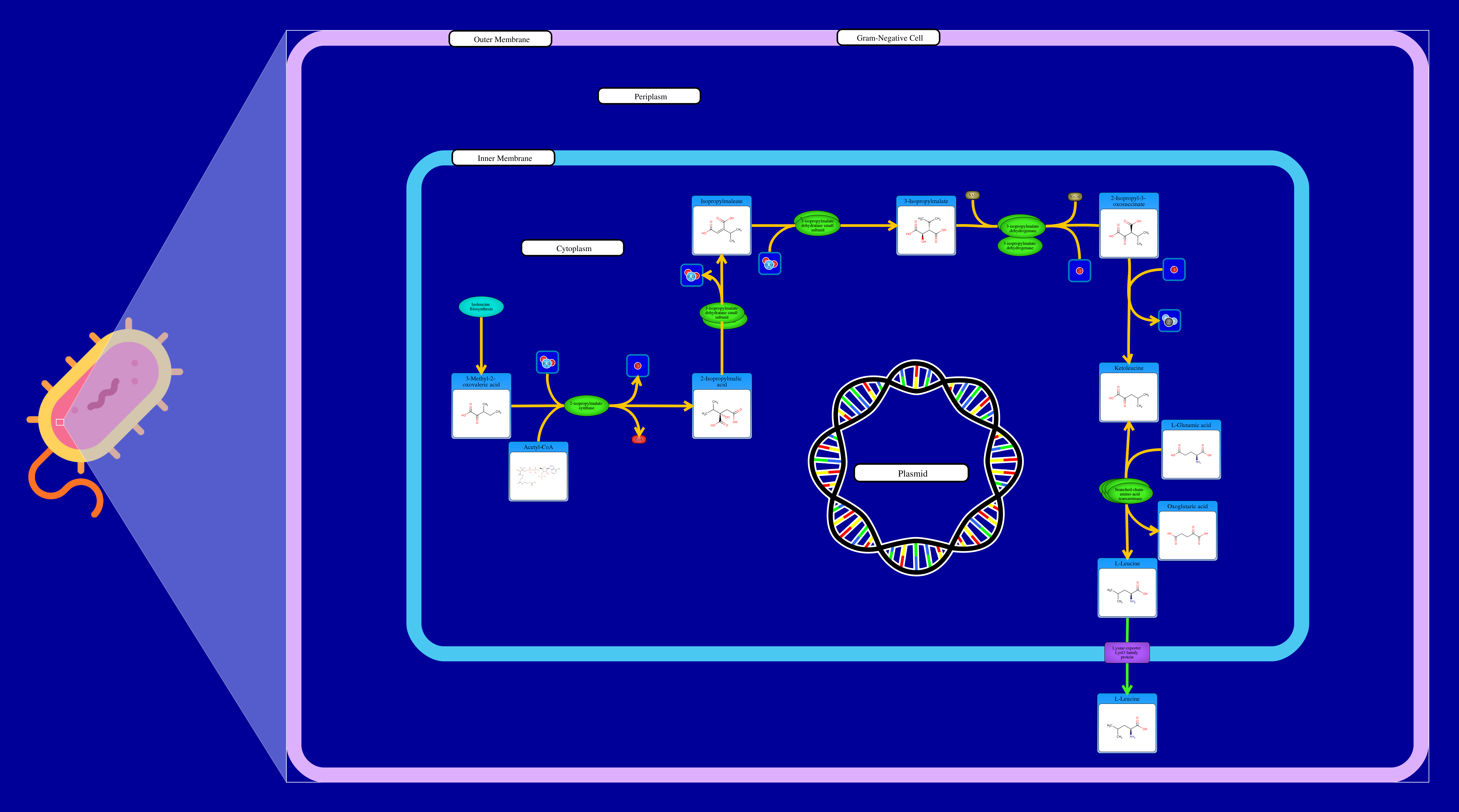 Leucine biosynthesis involves a five-step conversion process starting with the valine precursor 2-keto-isovalerate interacting with acetyl-CoA and water through a 2-isopropylmalate synthase resulting in Coenzyme A, hydrogen Ion and 2-isopropylmalic acid. The latter compound reacts with isopropylmalate isomerase which dehydrates the compound resulting in a Isopropylmaleate. This compound reacts with water through a isopropylmalate isomerase resulting in 3-isopropylmalate. This compound interacts with a NAD-driven D-malate / 3-isopropylmalate dehydrogenase results in 2-isopropyl-3-oxosuccinate. This compound interacts spontaneously with hydrogen resulting in the release of carbon dioxide and ketoleucine. Ketoleucine interacts in a reversible reaction with L-glutamic acid through a branched-chain amino-acid aminotransferase resulting in Oxoglutaric acid and L-leucine. L-leucine can then be exported outside the cytoplasm through a transporter: L-amino acid efflux transporter. In the final step, ketoleucine can be catalyzed to form L-leucine by branched-chain amino-acid aminotransferase (IlvE) and tyrosine aminotransferase (TryB). L-Glutamic acid can also be transformed into oxoglutaric acid by these two enzymes. Tyrosine aminotransferase can be suppressed by lecuine, and inhibited by 2-keto-isovarlerate and its end product, tyrosine. 2-ketoisocaproate can not be introduced if 2-keto-isovarlerate inhibit TyrB and IlvE is absent.