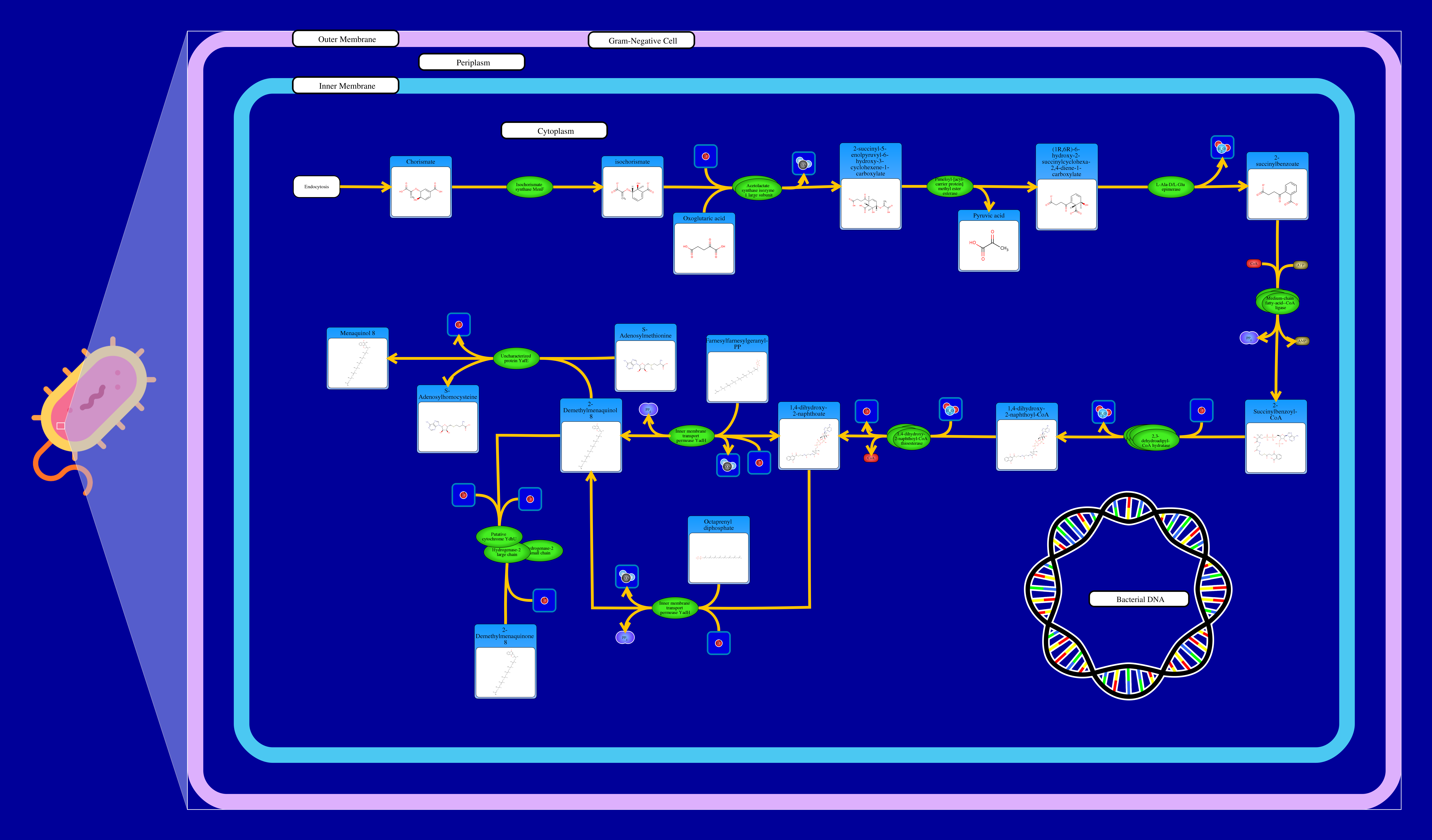 Menaquinol biosynthesis starts with chorismate being metabolized into isochorismate through a isochorismate synthase. Isochorismate then interacts with 2-oxoglutare and a hydrogen ion through a 2-succinyl-5-enolpyruvyl-6-hydroxy-3-cyclohexene-1-carboxylate synthase resulting in the release of a carbon dioxide and a 2-succinyl-5-enolpyruvyl-6-hydroxy-3-cyclohexene-1-carboxylate. The latter compound then interacts with (1R,6R)-2-succinyl-6-hydroxy-2,4-cyclohexadiene-1-carboxylate synthase resulting in the release of a pyruvate and a (1R,6R)-6-hydroxy-2-succinylcyclohexa-2,4-diene-1-carboxylate. This compound is the dehydrated through a o-succinylbenzoate synthase resulting in the release of a water molecule and a 2-succinylbenzoate. This compound then interacts with a coenzyme A and an ATP through a o-succinylbenzoate CoA ligase resulting in the release of a diphosphate, a AMP and a succinylbenzoyl-CoA. The latter compound interacts with a hydrogen ion through a 1,4-dihydroxy-2-naphthoyl-CoA synthase resulting in the release of a water molecule or a 1,4-dihydroxy-2-naphthoyl-CoA. This compound then interacts with water through a 1,4-dihydroxy-2-naphthoyl-CoA thioesterase resulting in the release of a coenzyme A, a hydrogen ion and a 1,4-dihydroxy-2-naphthoate.