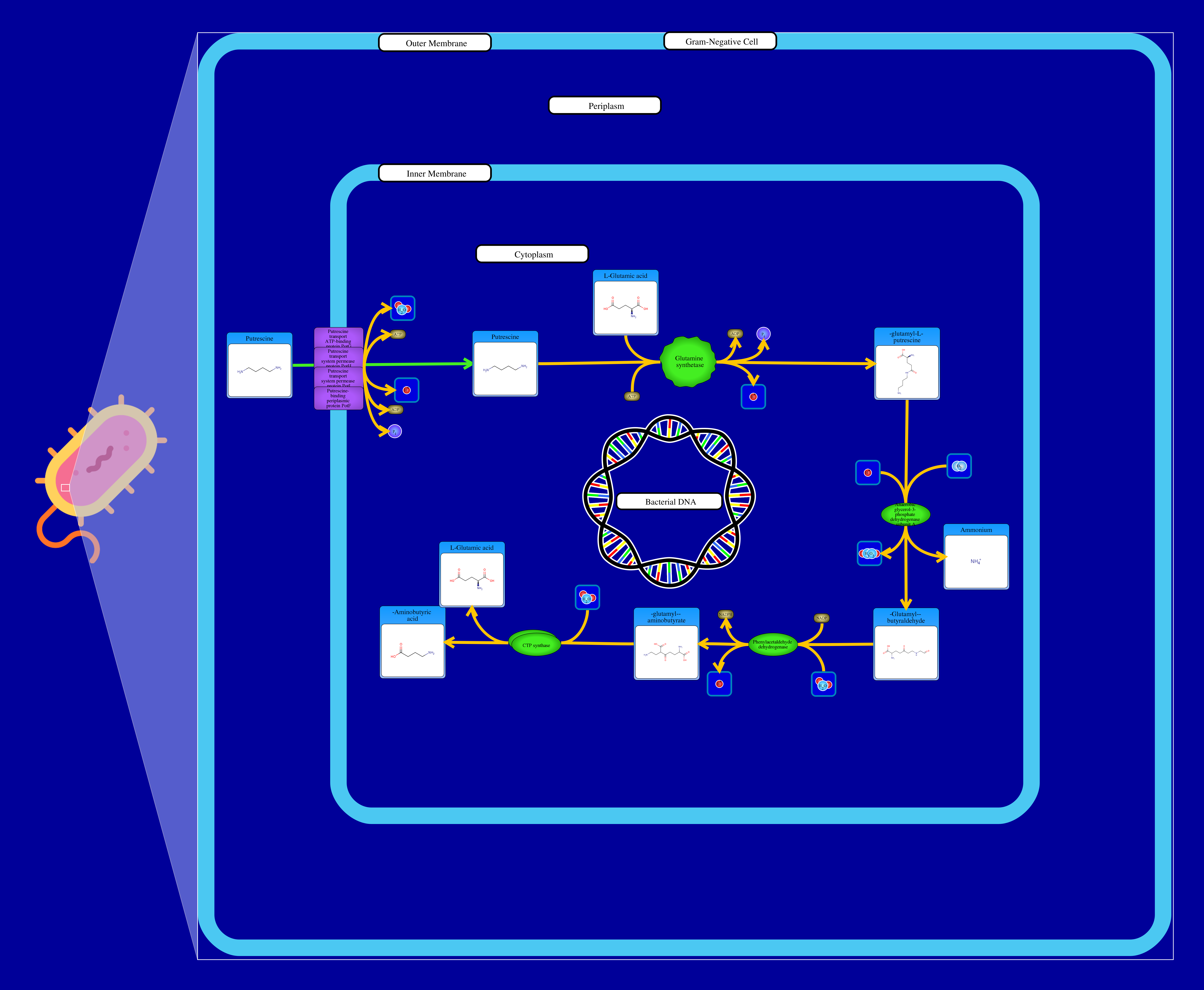 This pathway demonstrates the degradation of extracellular putrescine in E.coli. Putrescine is imported by putrescine transporter (encoded by puuP gene). Putrescine is γ-glutamylated by activation of ATP which generates γ-glutamyl-putrescine, phosphate, and ADP. γ-glutamyl-putrescine is oxidized by gamma-glutamylputrescine oxidoreductase to form γ-glutamyl-γ-butyraldehyde, also produce ammonium and water. Gamma-glutamyl-gamma-aminobutyraldehyde dehydrogenase dehydrogenates γ-glutamyl-γ-butyraldehyde to γ-glutamyl-γ-aminobutyrate, which is then dehydrogenated into γ-Aminobutyric acid and L-Glutamic acid by γ-glutamyl-γ-aminobutyrate hydrolase.