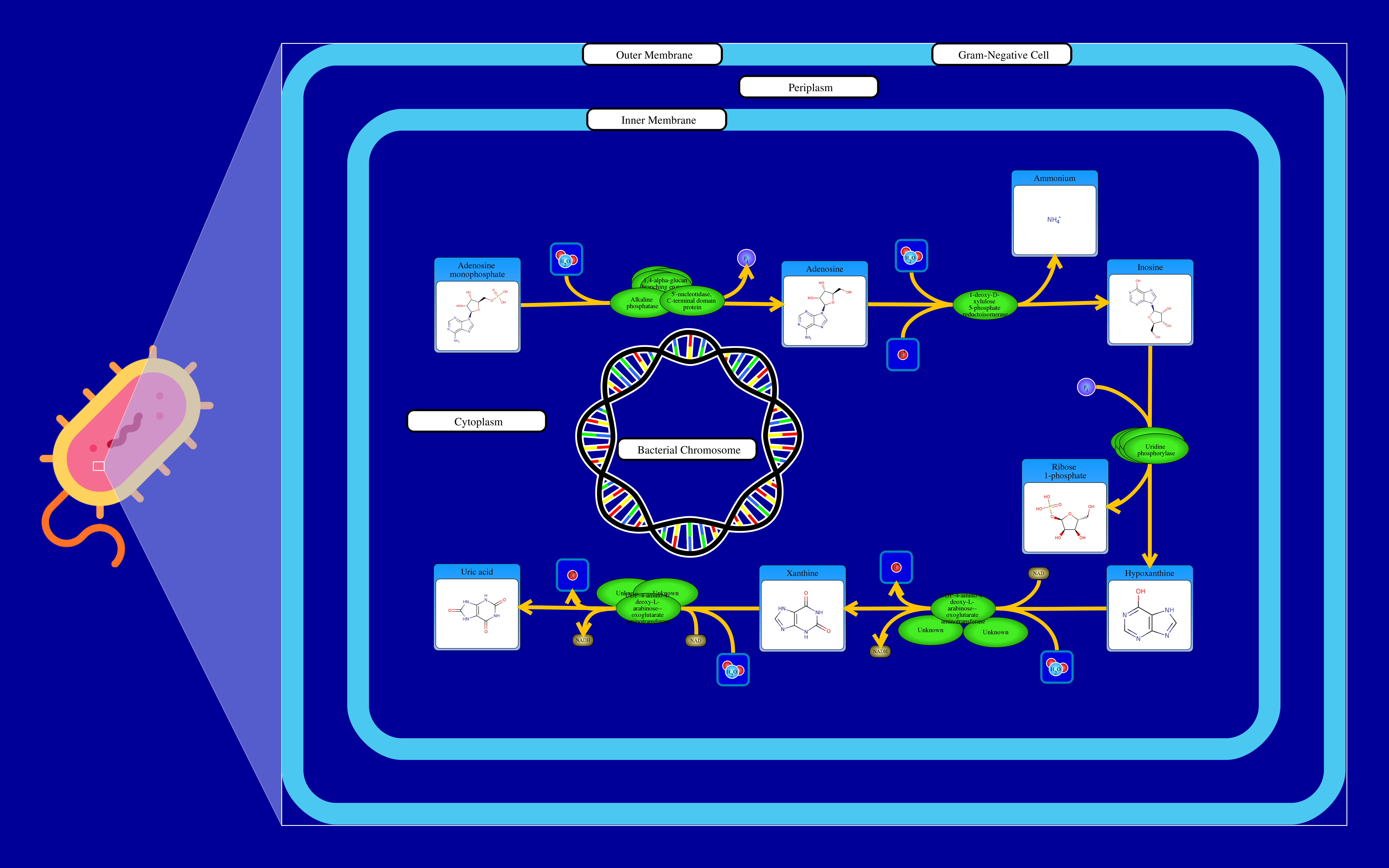 The degradation of of adenosine nucleotides starts with AMP reacting with water through a nucleoside monophosphate phosphatase results in the release of phosphate and a adenosine. Adenosine reacts with water and hydrogen ion through an adenosine deaminase resulting in the release of ammonium and a inosine. Inosine reacts with phosphate through a inosine phosphorylase resulting in the release of an alpha-D-ribose-1-phosphate and an hypoxanthine. Hypoxanthine reacts with a water molecule and a NAD molecule through an hypoxanthine hydroxylase resulting in the release of an hydrogen ion, an NADH and a xanthine. Xanthine in turn is degraded by reacting with a water molecule and a NAD through xanthine NAD oxidoreductase resulting in the release of NADH, a hydrogen ion and urate.