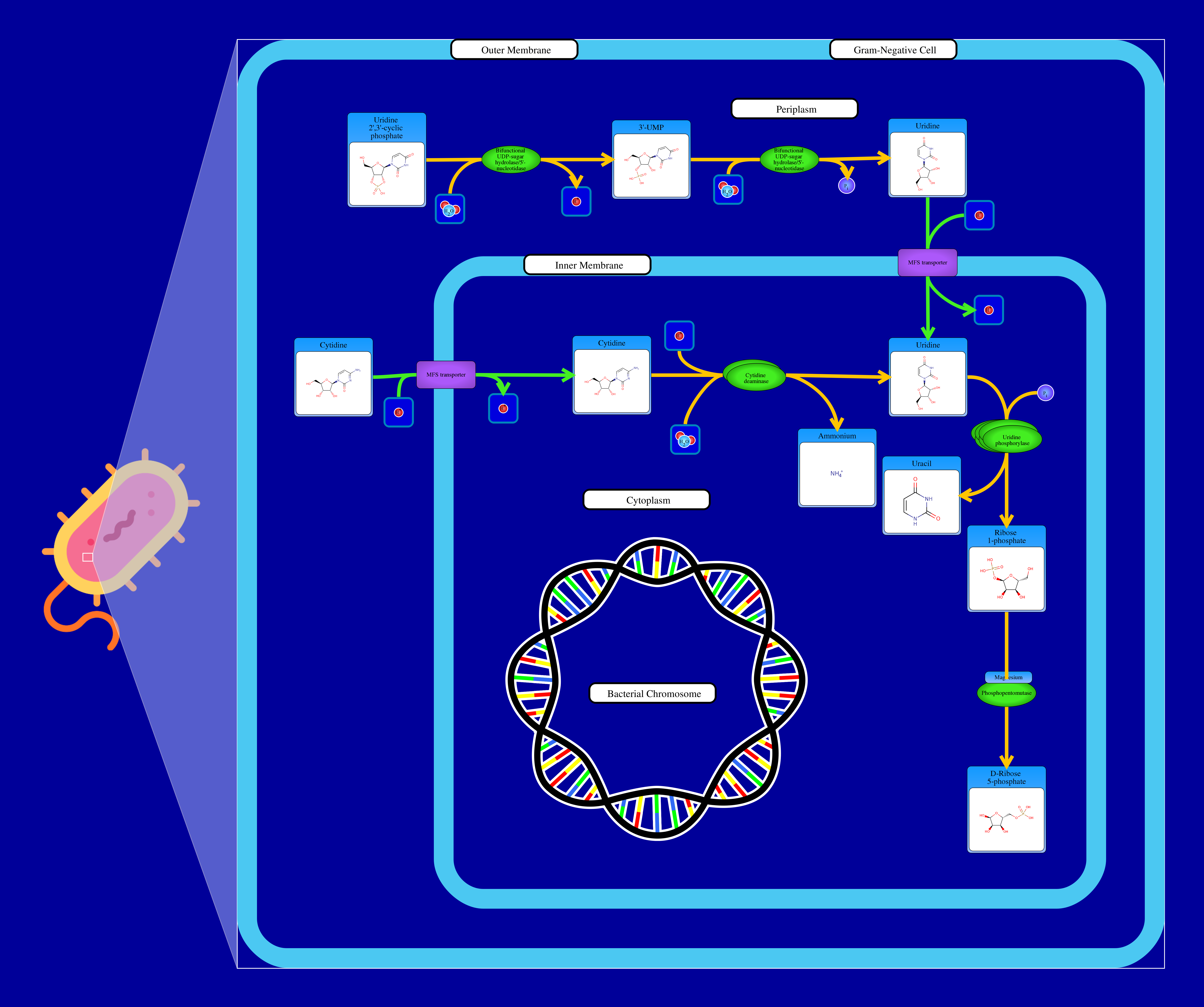 Cytidine and uridine are transported through their corresponding nucleoside hydrogen symporters. Once cytidine is incorporated into the cytosol, it is deaminated through a reaction with water and a hydrogen ion through a cytidine deaminase resulting in the release of ammonium and uridine. Uridine is then lyased by a phosphate through a uridine phosphorylase resulting in the release of a uracil and an alpha-D-ribose-1-phosphate. This compound is then transformed into an isomer D-ribose 5-phosphate through an alpha-D-ribose 1,5-phosphomutase. This compound is then incorporated into the pentose phosphate pathway.