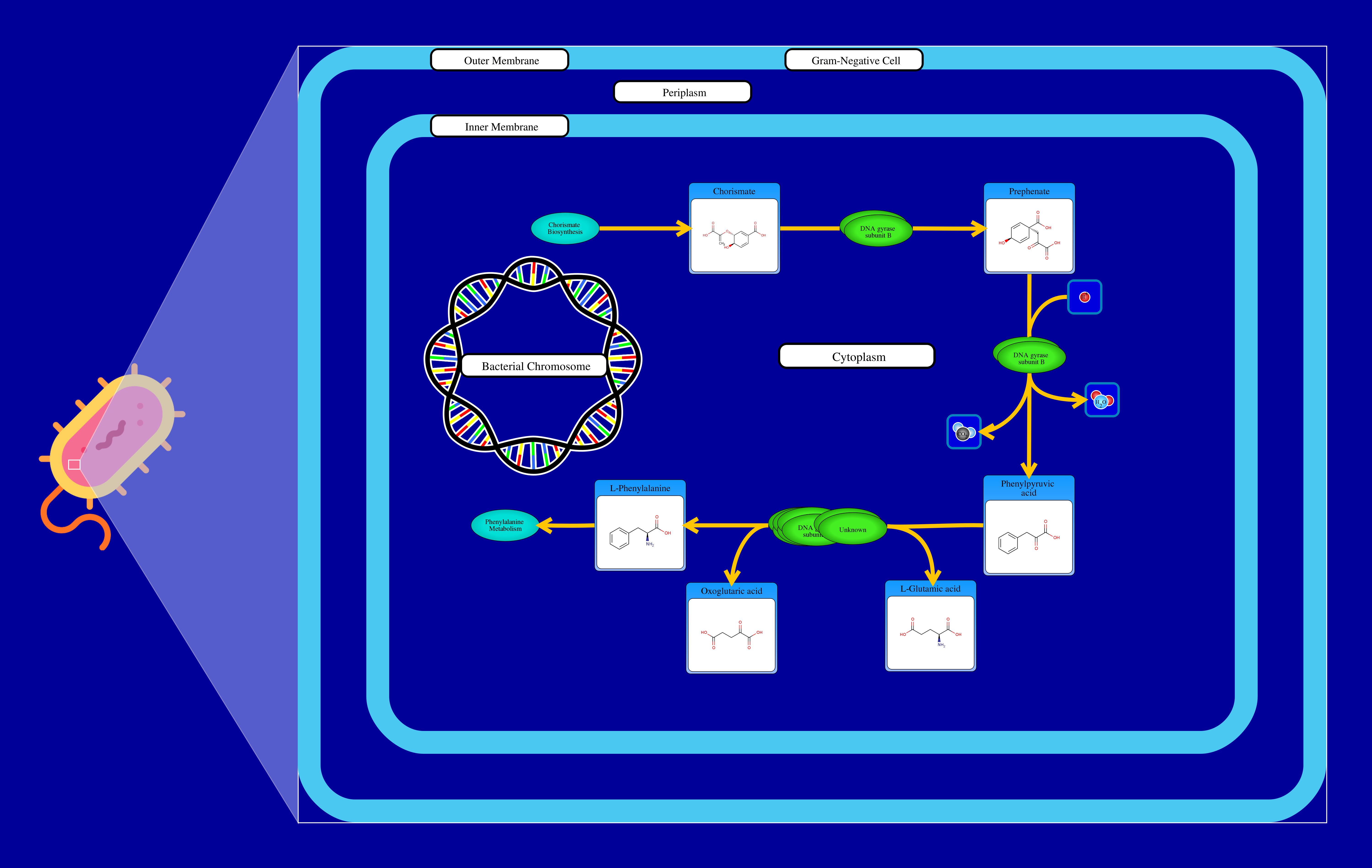 The phenylalaline biosynthesis pathways is connected with the chorismate biosynthesis pathway. Chorismate biosynthesis produce the chorismate, which further be converted to prephenate by P-protein. Combined with cofactor, H+, prephenate has been further converted to phenylpyruvic acid by P-protein with generated water and carbon dioxide. Phenylalanine transaminase catalyzes phenylpyruvic acid to phenylalaline, and also convert glutamic acid to oxoglutaric acid. Phenylalaline will be further used in phenylalaline metabolism.