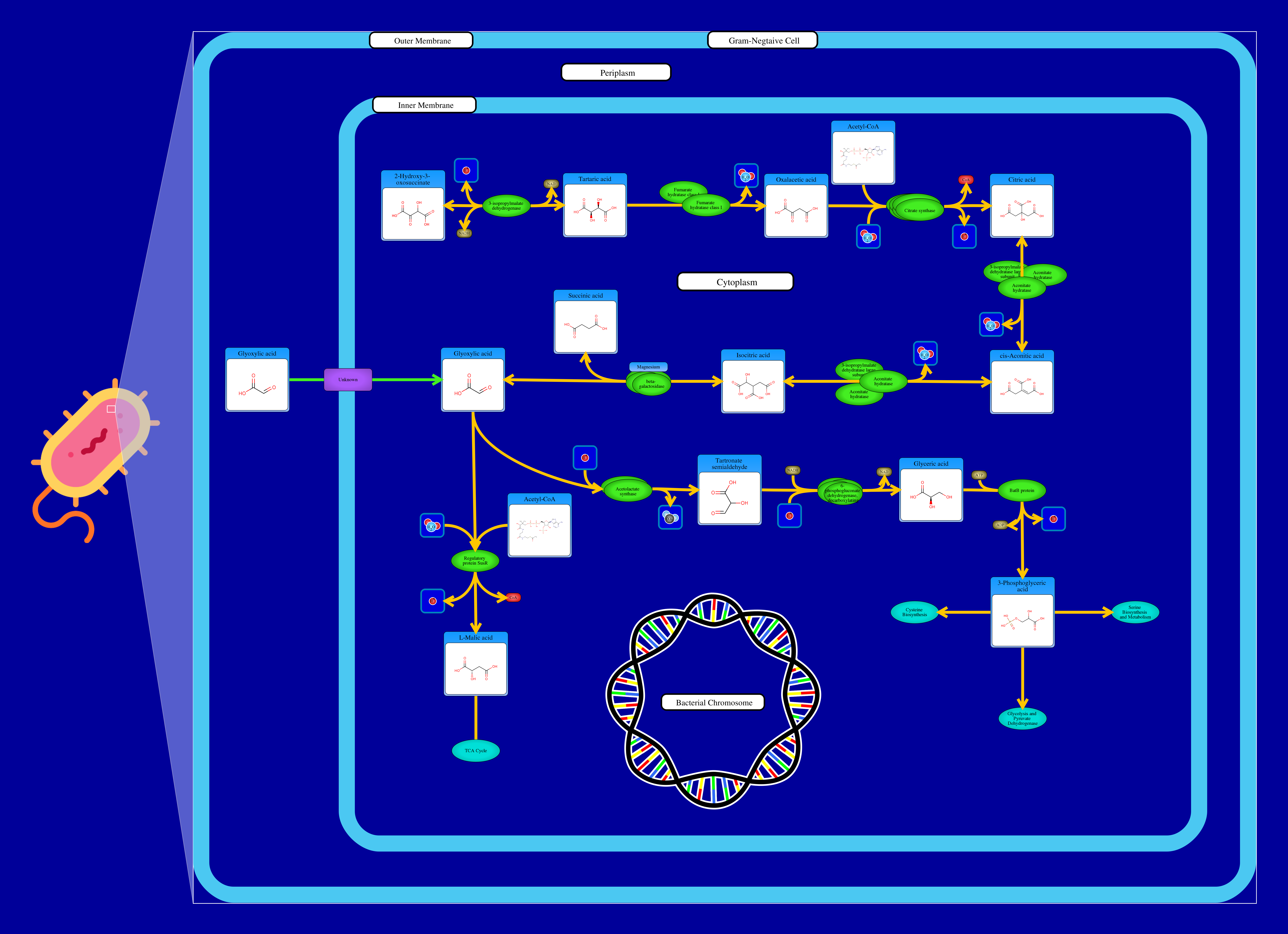 Oxaloglycolate (2-Hydroxy-3-oxosuccinate) interacts with a tartrate dehydrogenase resulting in a L-tartrate. L-tartrate then interacts with tartrate dehydrogenase resulting in a Oxaloacetate. Oxaloacetate and acetyl-coa interact to result in a citrate which is processed by a aconitate hydratase resulting in a cis-Aconitate and further more into a isocitrate which will eventually be procressed into a glyoxylic acid. Glyoxylic acid can either be metabolized into L-malic acid by a reaction with acetyl-CoA and Water through a malate synthase G which also releases hydrogen ion and Coenzyme A. L-malic acid is then incorporated into the TCA cycle. Glyoxylic acid can also be metabolized by glyoxylate carboligase, releasing a carbon dioxide and tartronate semialdehyde. The latter compound is then reduced by an NADH driven tartronate semialdehyde reductase 2 resulting in glyceric acid. Glyceric acid is phosphorylated by a glycerate kinase 2 resulting in a 3-phosphoglyceric acid. This compound is then integrated into various other pathways: cysteine biosynthesis, serine biosynthesis and glycolysis and pyruvate dehydrogenase.