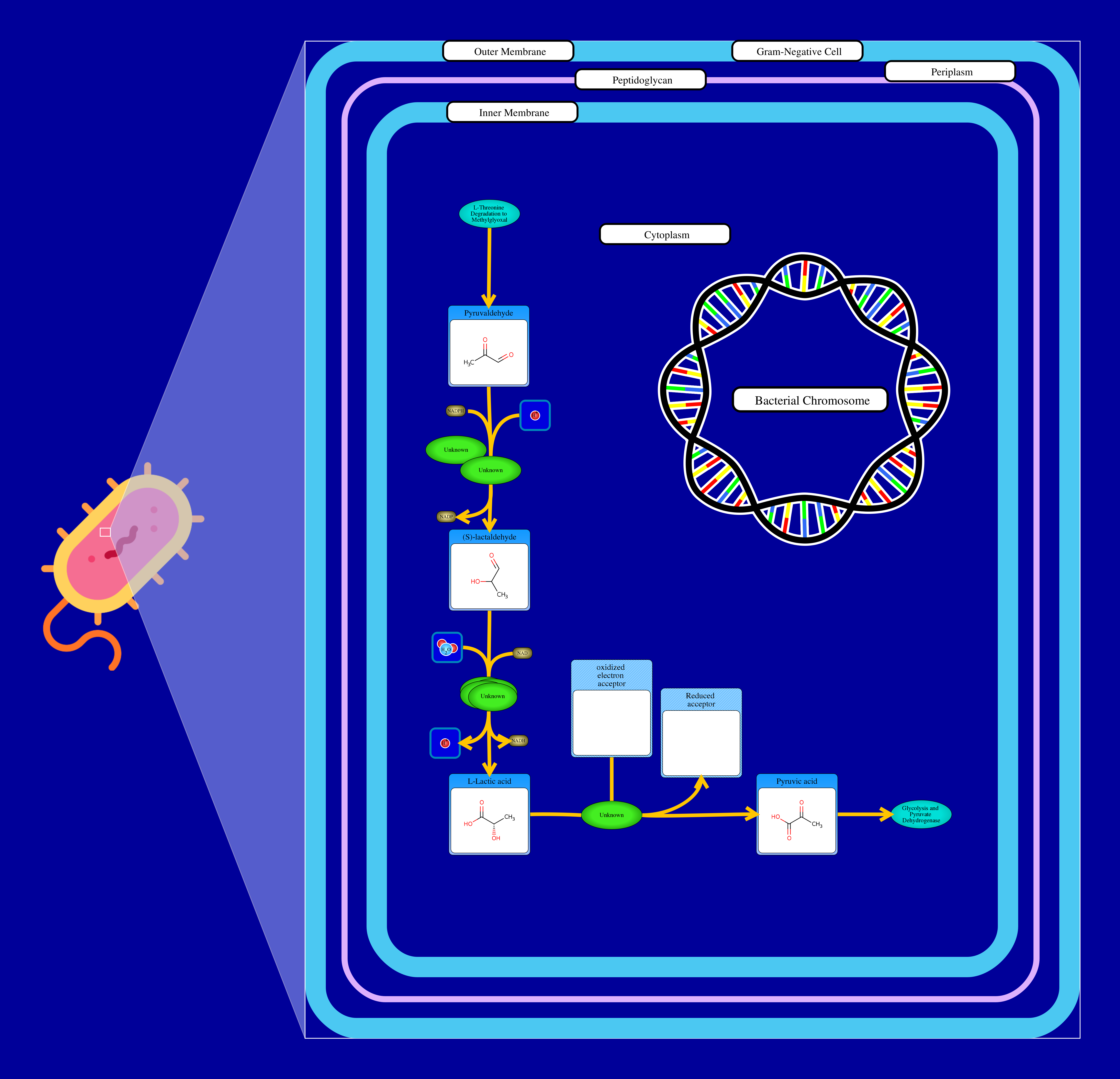 Methylglyoxal, also known as pyruvaldehyde, is a cytotoxic compound derived from pyruvic acid. In E. coli, there are at least eight pathways that are responsible for the detoxification of methylglyoxal. The first reaction in this pathway is the reduction of pyruvaldehyde to (S)-lactaldehyde, along with the cofactor NADH, catalyzed by 2,5-diketo-D-gluconic acid reductase subunits A and B. Following this, (S)-lactaldehyde is dehydrogenated into L-lactic acid by the lactaldehyde dehydrogenase enzyme, also using NAD as a cofactor. Finally, L-lactic acid is converted to pyruvic acid by L-lactate dehydrogenase in a reaction involving the reduction of an electron acceptor. Pyruvic acid is then used in glycolysis and pyruvate dehydrogenase pathways.
