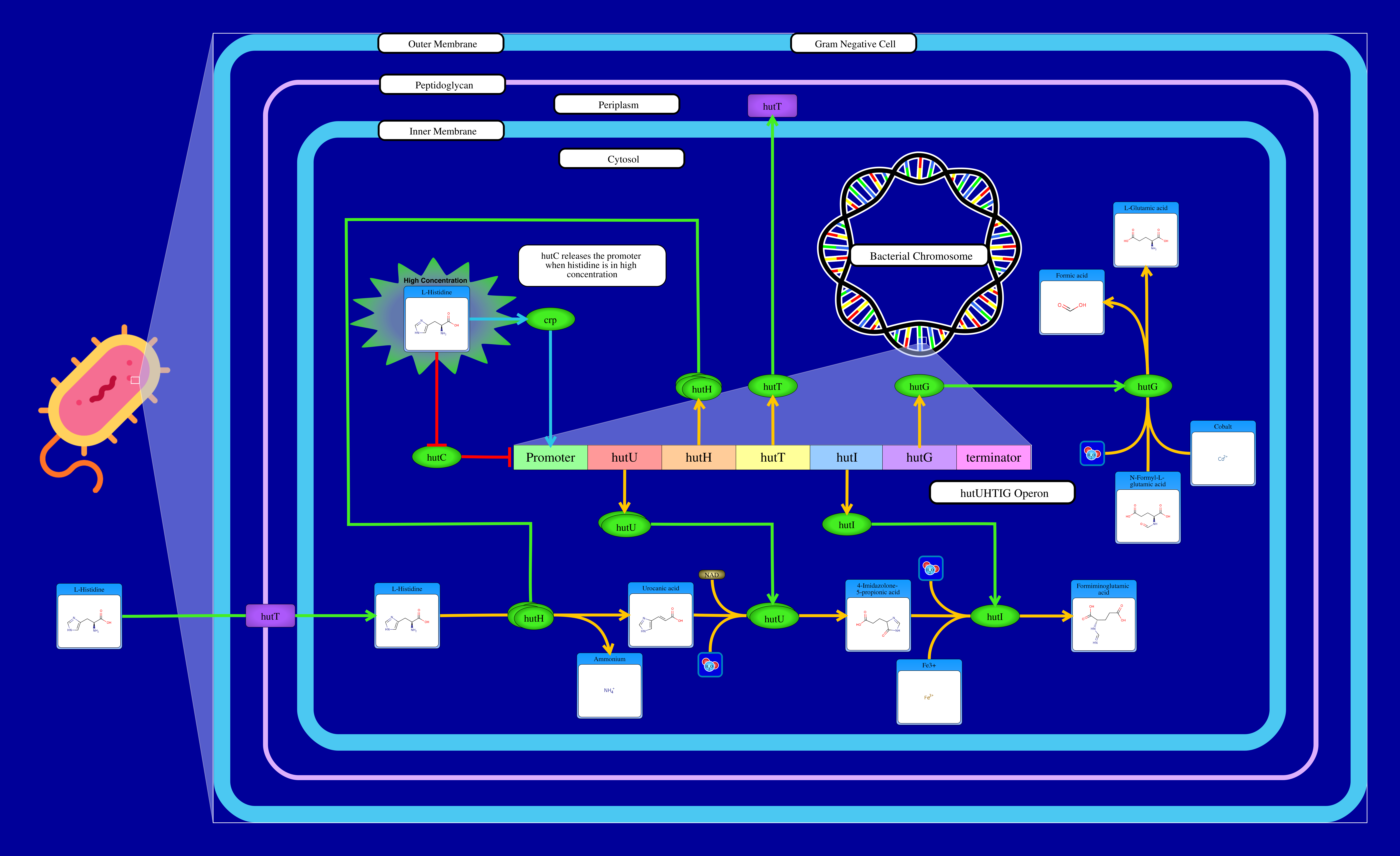 The regulation of the hutUHTIG operon. The operon is inhibited by hutC (Histidine utilization repressor) and activated by high concentrations of histidine. When histidine concentrations are low, hutC binds to the promoter inhibiting crp from transcribing the operon. When histidine concentrations are high, hutC releases the promoter, allowing crp to bind and transcribe the operon. There are five products from this operon: hutU (Urocanate hydratase), hutH (Histidine ammonia-lyase), hutT (L-histidine transporter), hutI (Imidazolonepropionase) and hutG (N-formylglutamate deformylase). HutU, hutH, hutI and hutG are enzymes used to degrade histidine to glutamate. HutH is used to change histidine to urocanate. HutU is used to turn urocanate to 4-imidazolone-5-propanoate. HutI is used to turn 4-imidazolone-5-propanoate to N-formimidoyl-L-glutamate. HutG is used to turn N-formyl-L-glutamate to glutamate. Histidine is brought into the cell by the hutT transporter.
