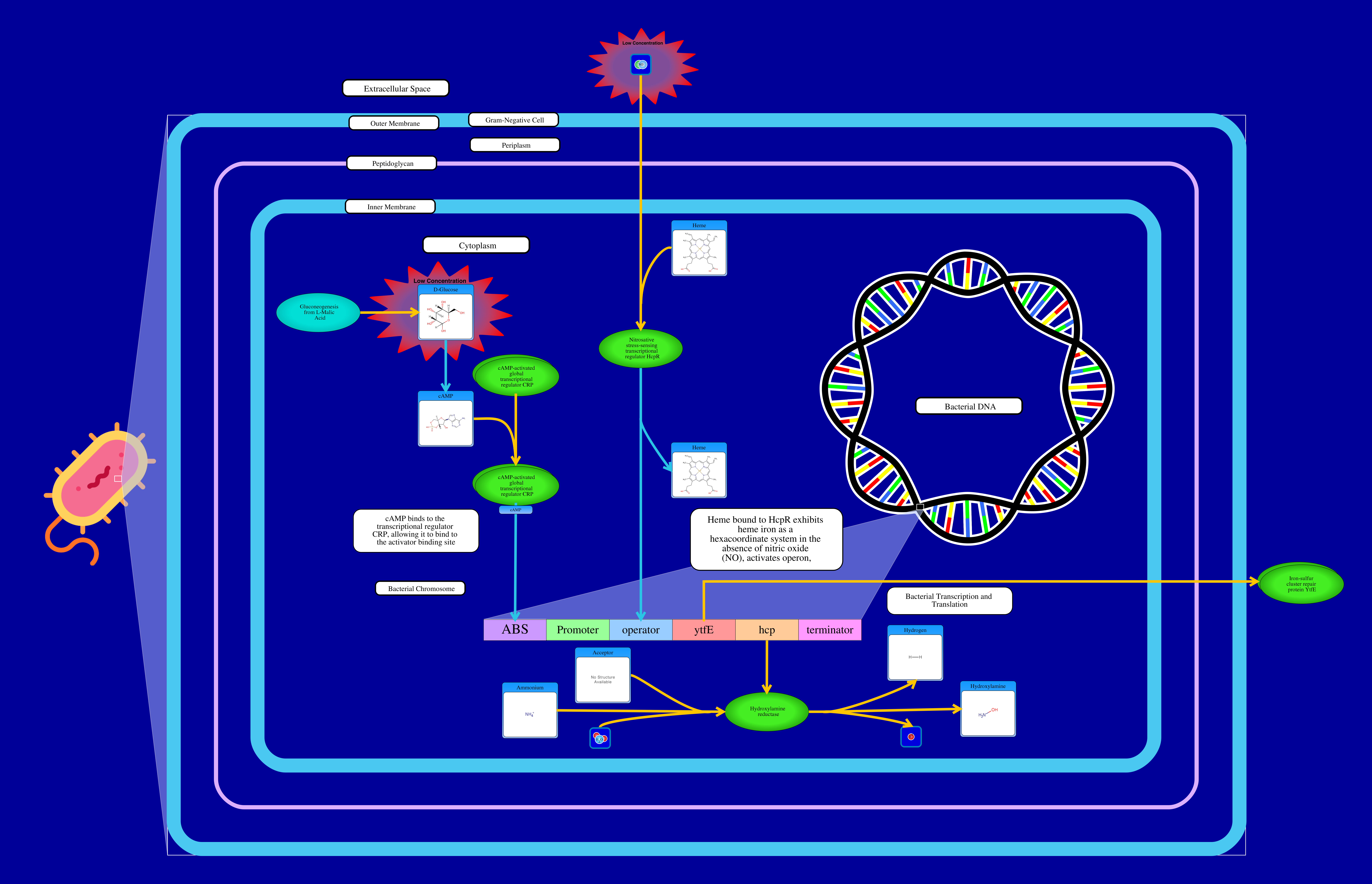 The nitric oxide (NO) effector pathway is a bacterial defense system that protects cells from the toxic effects of nitric oxide, a reactive nitrogen species produced by host immune responses or environmental sources. This pathway is regulated by HcpR, a transcriptional regulator that activates genes involved in nitrosative stress resistance.