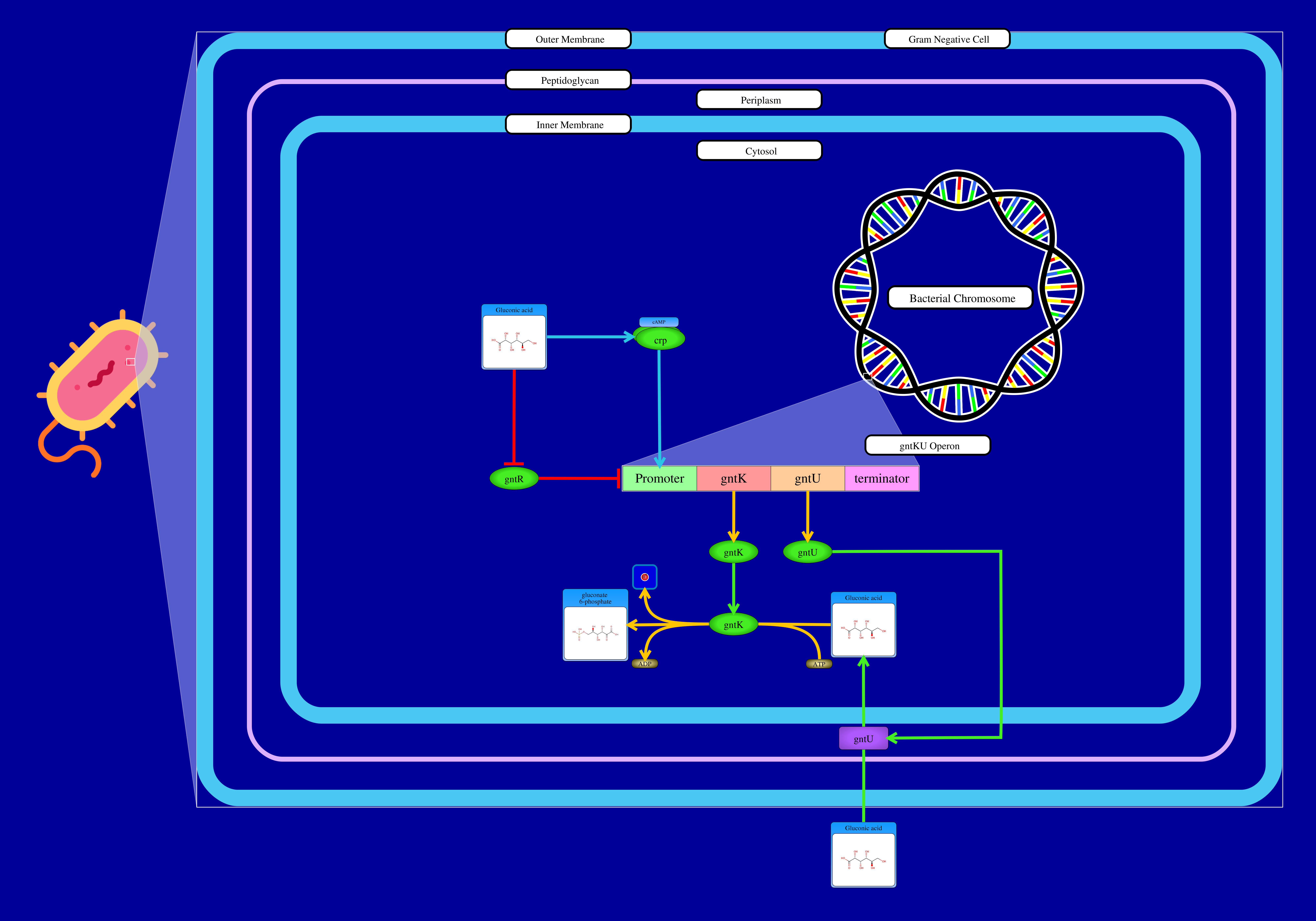 The regulation of the gntKU operon. The operon is inhibited by gntR (HTH-type transcriptional regulator) and activated by gluconate. GntR binds to the promoter, inhibiting crp from binding and transcribing the operon. When gluconate is present in the cell, gntR releases the promoter, allowing for expression of the operon. There are two products of this operon: gntK (Thermoresistant gluconokinase) and gntU (Low-affinity gluconate transporter). Both products are used in the utilization of gluconate. GntK is an enzyme used to turn gluconate to gluconate-6-phophate. GntU is a transporter used to transport gluconate into the cell.