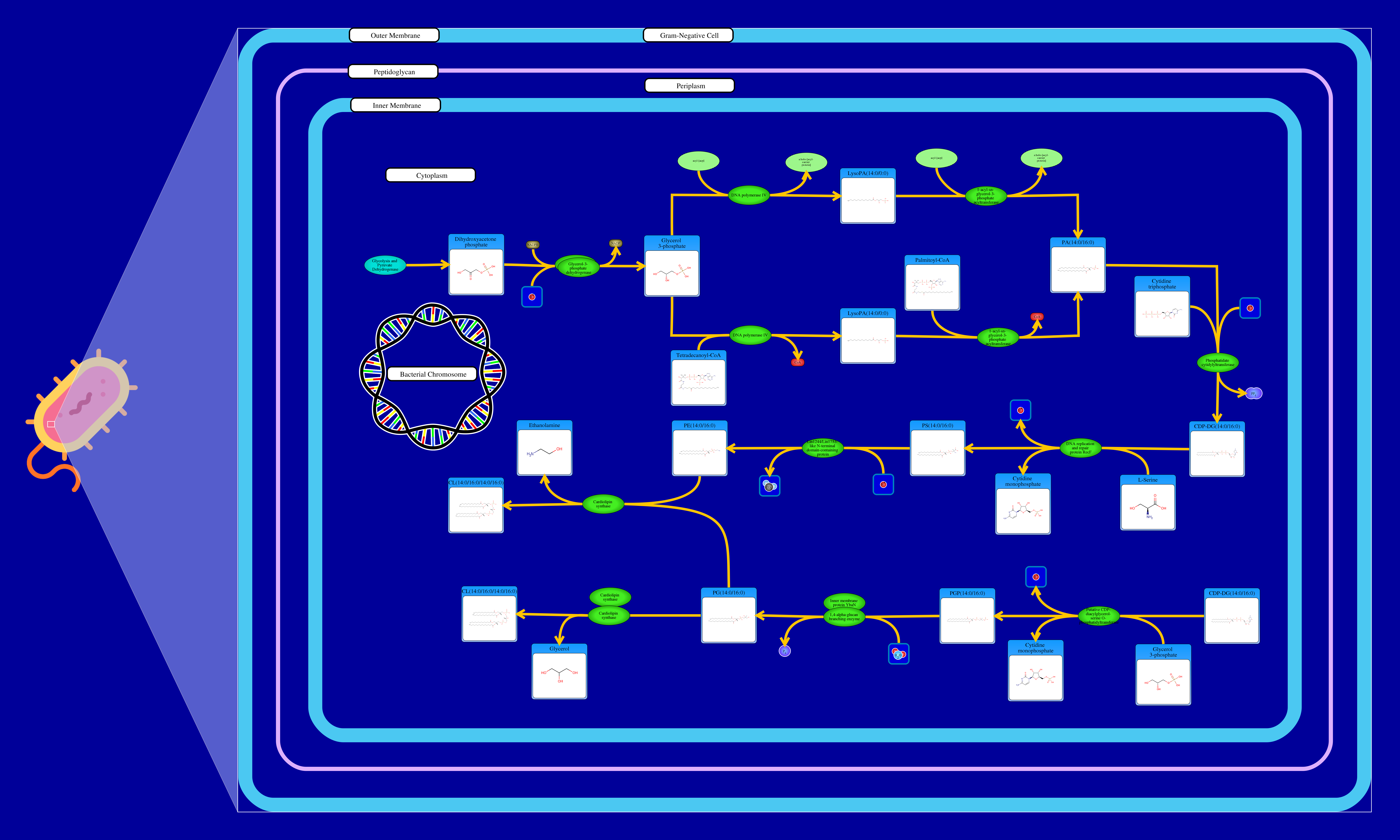 Phospholipids are membrane components in E. coli. The major phospholipids of E. coli are phosphatidylethanolamine, phosphatidylglycerol, and cardiolipin. All phospholipids contain sn-glycerol-3-phosphate esterified with fatty acids at the sn-1 and sn-2 positions. The reaction starts from a glycerone phosphate (dihydroxyacetone phosphate) produced in glycolysis. The glycerone phosphate is transformed into an sn-glycerol 3-phosphate (glycerol 3 phosphate) by NADPH-driven glycerol-3-phosphate dehydrogenase. sn-Glycerol 3-phosphate is transformed to a 1-acyl-sn-glycerol 3-phosphate (lysophosphatidic acid). This can be achieved by an sn-glycerol-3-phosphate acyltransferase that interacts either with a long-chain acyl-CoA or with an acyl-[acp]. The 1-acyl-sn-glycerol 3-phosphate is transformed into a 1,2-diacyl-sn-glycerol 3-phosphate (phosphatidic acid) through a 1-acylglycerol-3-phosphate O-acyltransferase. This compound is then converted into a CPD-diacylglycerol through a CTP phosphatidate cytididyltransferase. CPD-diacylglycerol can be transformed either into an L-1-phosphatidylserine or an L-1-phosphatidylglycerol-phosphate through a phosphatidylserine synthase or a phosphatidylglycerophosphate synthase, respectively. The L-1-phosphatidylserine transforms into L-1-phosphatidylethanolamine through a phosphatidylserine decarboxylase. On the other hand, L-1-phosphatidylglycerol-phosphate gets transformed into an L-1-phosphatidyl-glycerol through a phosphatidylglycerophosphatase. These 2 products combine to produce a cardiolipin and an ethanolamine. The L-1 phosphatidyl-glycerol can also interact with cardiolipin synthase resulting in a glycerol and a cardiolipin.