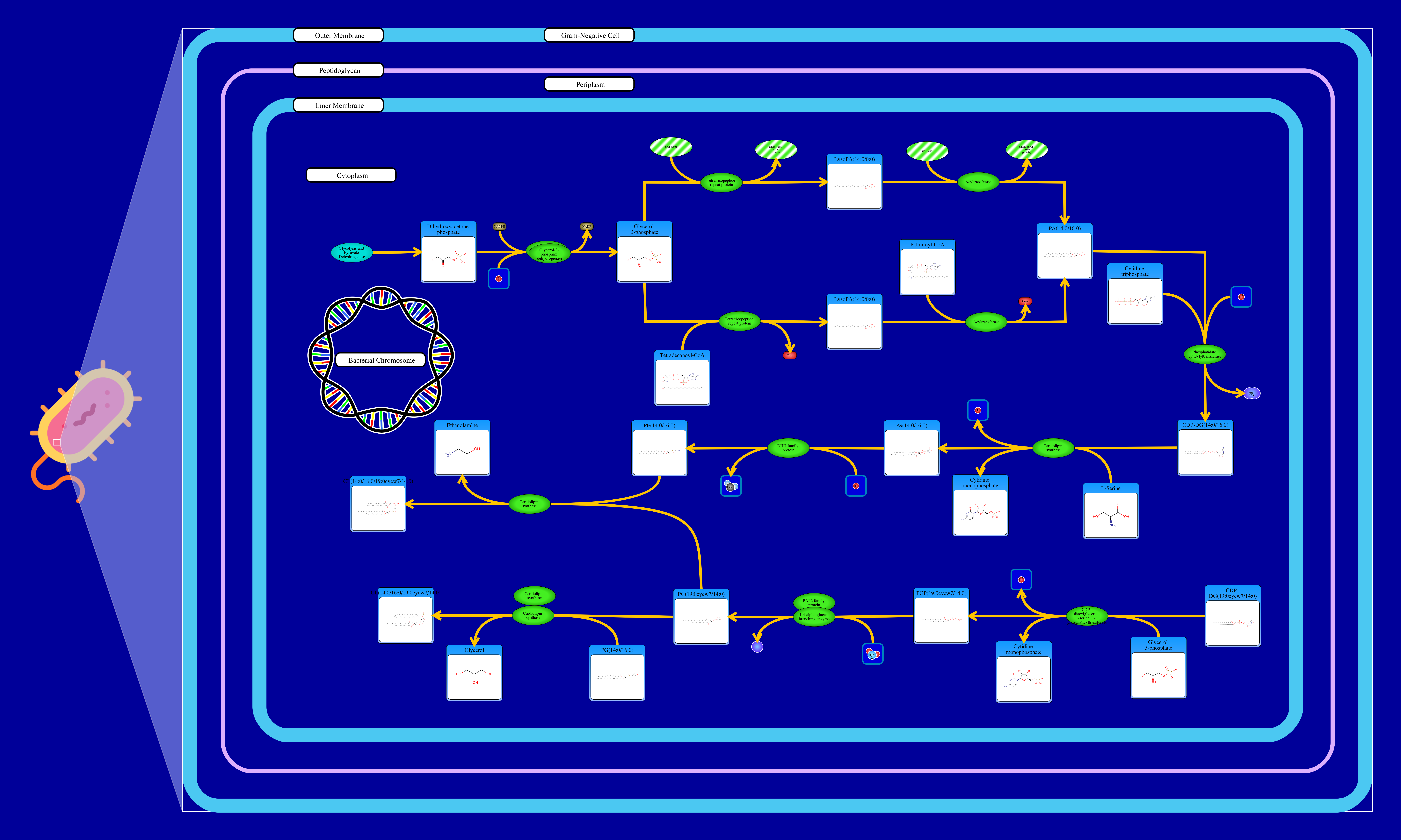 Phospholipids are membrane components in E. coli. The major phospholipids of E. coli are phosphatidylethanolamine, phosphatidylglycerol, and cardiolipin. All phospholipids contain sn-glycerol-3-phosphate esterified with fatty acids at the sn-1 and sn-2 positions. The reaction starts from a glycerone phosphate (dihydroxyacetone phosphate) produced in glycolysis. The glycerone phosphate is transformed into an sn-glycerol 3-phosphate (glycerol 3 phosphate) by NADPH-driven glycerol-3-phosphate dehydrogenase. sn-Glycerol 3-phosphate is transformed to a 1-acyl-sn-glycerol 3-phosphate (lysophosphatidic acid). This can be achieved by an sn-glycerol-3-phosphate acyltransferase that interacts either with a long-chain acyl-CoA or with an acyl-[acp]. The 1-acyl-sn-glycerol 3-phosphate is transformed into a 1,2-diacyl-sn-glycerol 3-phosphate (phosphatidic acid) through a 1-acylglycerol-3-phosphate O-acyltransferase. This compound is then converted into a CPD-diacylglycerol through a CTP phosphatidate cytididyltransferase. CPD-diacylglycerol can be transformed either into an L-1-phosphatidylserine or an L-1-phosphatidylglycerol-phosphate through a phosphatidylserine synthase or a phosphatidylglycerophosphate synthase, respectively. The L-1-phosphatidylserine transforms into L-1-phosphatidylethanolamine through a phosphatidylserine decarboxylase. On the other hand, L-1-phosphatidylglycerol-phosphate gets transformed into an L-1-phosphatidyl-glycerol through a phosphatidylglycerophosphatase. These 2 products combine to produce a cardiolipin and an ethanolamine. The L-1 phosphatidyl-glycerol can also interact with cardiolipin synthase resulting in a glycerol and a cardiolipin.